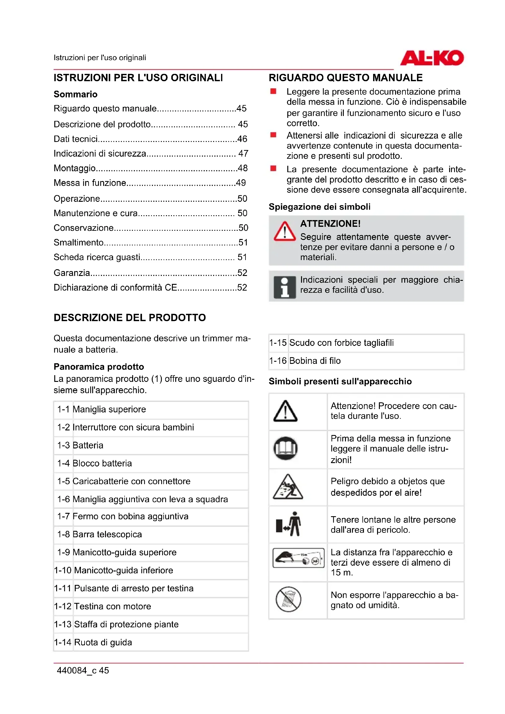 Scarica le istruzioni per il tuo Tagliaerba in formato PDF gratuitamente! Trova il tuo manuale GTLi 18V - AL-KO e riprendi in mano il tuo dispositivo elettronico. In questa pagina sono pubblicati tutti i documenti necessari per l'utilizzo del tuo dispositivo. GTLi 18V del marchio AL-KO.