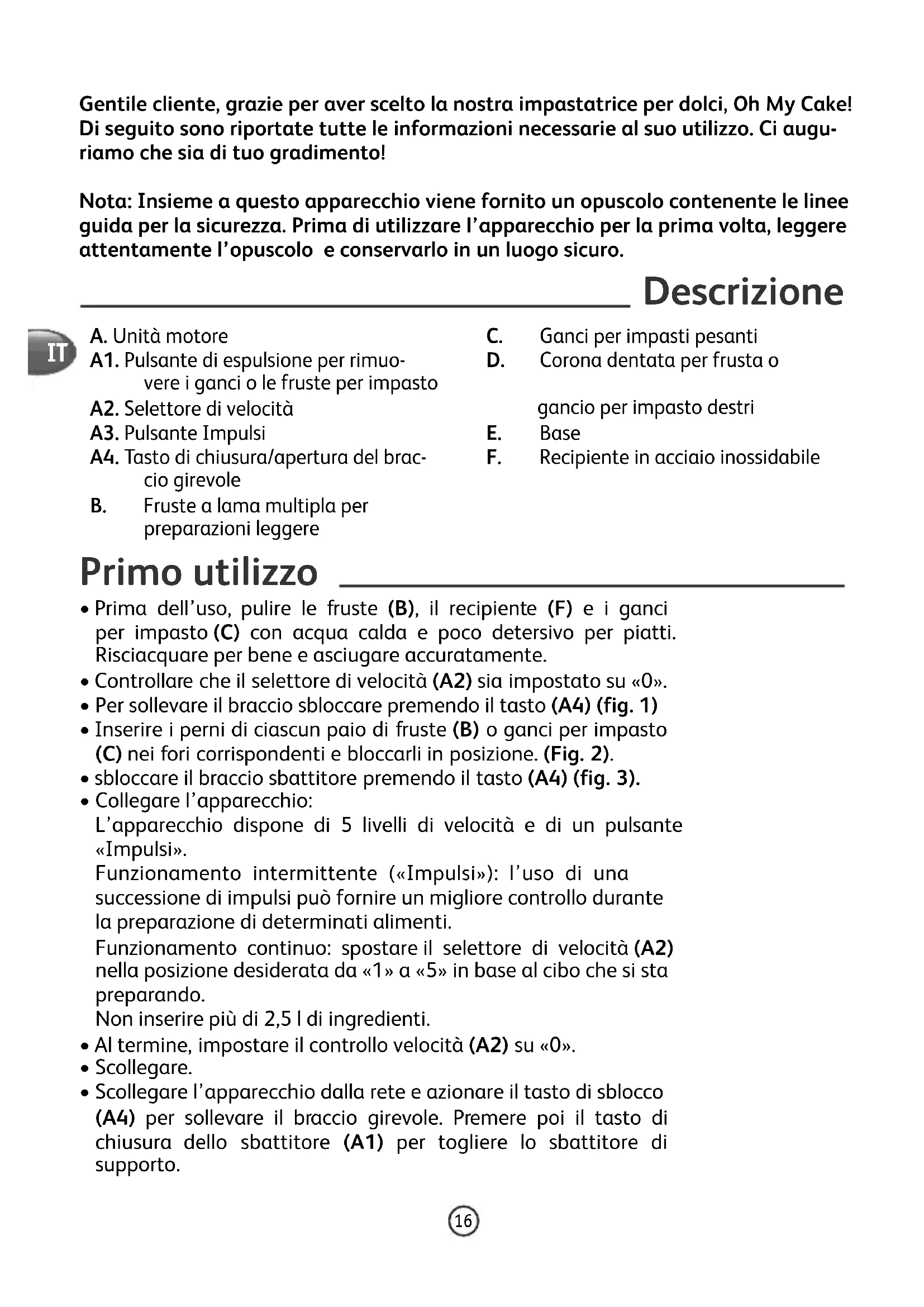 - Scollegare l’apparecchio dalla rete e azionare il tasto di sblocco (A4) per sollevare il braccio girevole. Premere poi il tasto di chiusura dello sbattitore (A1) per togliere lo sbattitore di supporto. Gentile cliente, grazie per aver scelto la nostra impastatrice per dolci, Oh My Cake! Di seguito sono riportate tutte le informazioni necessarie al suo utilizzo. Ci augu- riamo che sia di tuo gradimento! Nota: Insieme a questo apparecchio viene fornito un opuscolo contenente le linee guida per la sicurezza. Prima di utilizzare l’apparecchio per la prima volta, leggere attentamente l’opuscolo e conservarlo in un luogo sicuro. A. Unità motore A1. Pulsante di espulsione per rimuo- vere i ganci o le fruste per impasto A2. Selettore di velocità A3. Pulsante Impulsi A4. Tasto di chiusura/apertura del brac- cio girevole B. Fruste a lama multipla per preparazioni leggere C. Ganci per impasti pesanti D. Corona dentata per frusta o gancio per impasto destri E. Base F. Recipiente in acciaio inossidabile IT17 Avvertimento: fare attenzione a capelli lunghi, gioielli e altri oggetti che potrebbero incastrarsi nella corona vicino alla cerniera. Quantità e tempi di preparazione Fruste (B) per: salse, albumi d’uovo, creme, maionese, impasti per pan di spagna e pastelle leggere (ad es. pastella per pancake). Quantità max Tempo max Velocità albumi d’uovo 6 albumi d’uovo 4 min. 5 Maionese 2 tuorli, 1 cucchiaio di senape, 200 g di olio vegetale 3 min. 1 per 30 s. Quindi 5 Torta 300 g di farina, 300 g di zucchero, 300 g di burro ammorbidito, 6 uova 9 min. Da 1 a 5 Crosta del pane (aggiungere prima di cuocere il pane) 410 g di miele, 30 g di maltosio spalmabile, 30 g di farina 20 secondi 5 + "Im- pulsi" Ganci per impasto (C) per: tutti i tipi di impasti pesanti e spessi, come impasti per pane o pizza, pasta frolla, ecc. Quantità max Tempo max Velocità Impasto per pane 500 g di farina, 300 ml di acqua, 8 g di lievito secco 5 min. 5 Conservazione Non conservare l’apparecchio in un ambiente umido. Pulizia