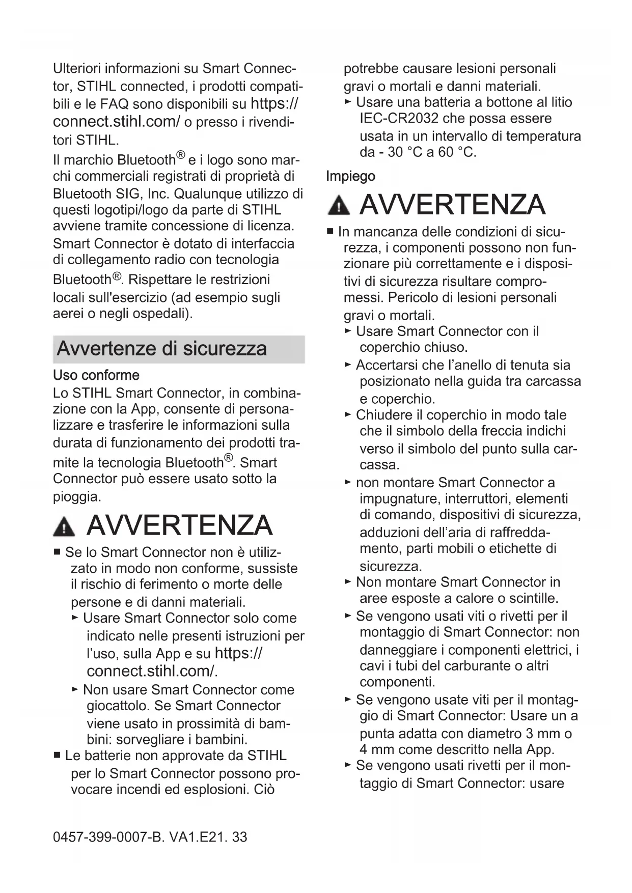 L'USO E CONSERVARE. Leggere e rispettare le seguenti informazioni e avvertenze di sicurezza. Un uso improprio può provocare gravi lesioni. Leggere e seguire tutte le avvertenze riportate sulle istru‐ zioni per l’uso del prodotto STIHL o del prodotto terzo che viene applicato allo STIHL Smart Connector. 32 0457-399-0007-B. VA1.E21.Ulteriori informazioni su Smart Connec‐ tor, STIHL connected, i prodotti compati‐ bili e le FAQ sono disponibili su https:// connect.stihl.com/ o presso i rivendi‐ tori STIHL. Il marchio Bluetooth