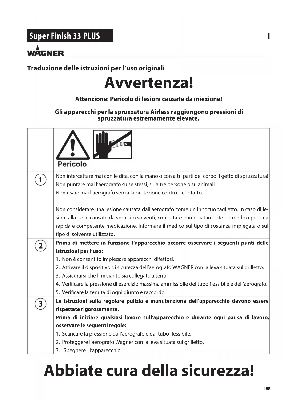 Non intercettare mai con le dita, con la mano o con altri parti del corpo il getto di spruzzatura!Non puntare mai l‘aerografo su se stessi, su altre persone o su animali.Non usare mai l‘aerografo senza la protezione contro il contatto.Non considerare una lesione causata dall‘aerografo come un innocuo taglietto. In caso di le-sioni alla pelle causate da vernici o solventi, consultare immediatamente un medico per una rapida e competente medicazione. Informare il medico sul tipo di sostanza impiegata o sul tipo di solvente utilizzato. Prima di mettere in funzione l’apparecchio occorre osservare i seguenti punti delle istruzioni per l’uso:1. Non è consentito impiegare apparecchi difettosi.2. Attivare il dispositivo di sicurezza dell‘aerografo WAGNER con la leva situata sul grilletto.3. Assicurarsi che l‘impianto sia collegato a terra.4. Vericare la pressione di esercizio massima ammissibile del tubo essibile e dell‘aerografo.5. Vericare la tenuta di ogni giunto e raccordo. Le istruzioni sulla regolare pulizia e manutenzione dell’apparecchio devono essere rispettate rigorosamente.Prima di iniziare qualsiasi lavoro sull‘apparecchio e durante ogni pausa di lavoro, osservare le seguenti regole:1. Scaricare la pressione dall‘aerografo e dal tubo essibile.2. Proteggere l‘aerografo Wagner con la leva situata sul grilletto.3. Spegnere l‘apparecchio. Abbiate cura della sicurezza! Traduzione delle istruzioni per l’uso originali110 Super Finish 33 PLUS