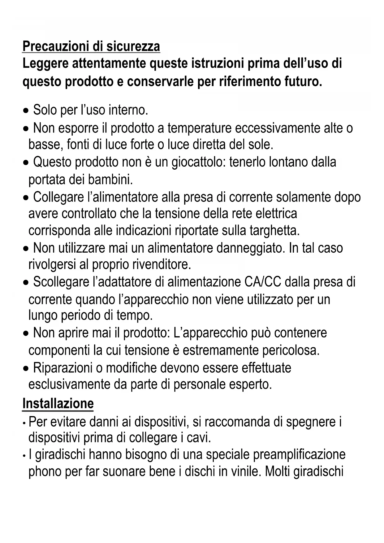 - I giradischi hanno bisogno di una speciale preamplificazione phono per far suonare bene i dischi in vinile. Molti giradischihanno questo incorporato, altri no. Questo prodotto non ha un preamplificatore phono incorporato.