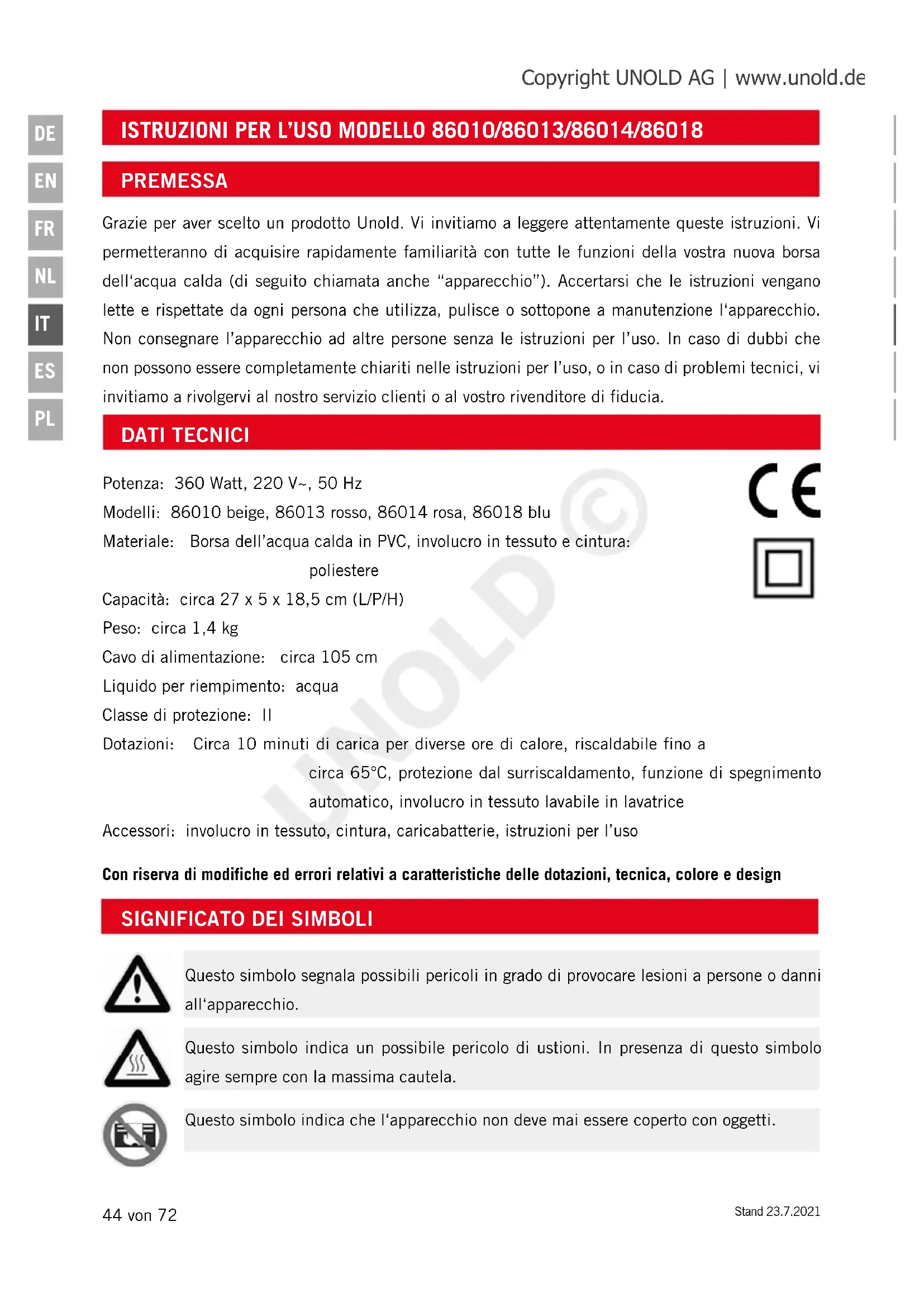 Questo simbolo segnala possibili pericoli in grado di provocare lesioni a persone o danni all‘apparecchio. Questo simbolo indica un possibile pericolo di ustioni. In presenza di questo simbolo agire sempre con la massima cautela. Questo simbolo indica che l‘apparecchio non deve mai essere coperto con oggetti. PREMESSA Grazie per aver scelto un prodotto Unold. Vi invitiamo a leggere attentamente queste istruzioni. Vi permetteranno di acquisire rapidamente familiarità con tutte le funzioni della vostra nuova borsa dell‘acqua calda (di seguito chiamata anche “apparecchio”). Accertarsi che le istruzioni vengano lette e rispettate da ogni persona che utilizza, pulisce o sottopone a manutenzione l‘apparecchio. Non consegnare l’apparecchio ad altre persone senza le istruzioni per l’uso. In caso di dubbi che non possono essere completamente chiariti nelle istruzioni per l’uso, o in caso di problemi tecnici, vi invitiamo a rivolgervi al nostro servizio clienti o al vostro rivenditore di fiducia. Copyright UNOLD AG | www.unold.de UNOLD ©Stand 23.7.2021 45 von 72
