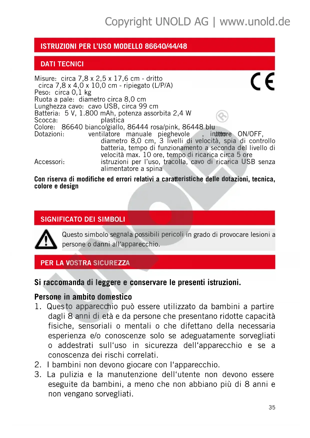 Questo simbolo segnala possibili pericoli in grado di provocare lesioni a persone o danni all‘apparecchio. Misure: circa 7,8 x 2,5 x 17,6 cm - dritto circa 7,8 x 4,0 x 10,0 cm - ripiegato (L/P/A) Peso: circa 0,1 kg Ruota a pale: diametro circa 8,0 cm Lunghezza cavo: cavo USB, circa 99 cm Batteria: 5 V, 1.800 mAh, potenza assorbita 2,4 W Scocca: plastica Colore: 86640 bianco/giallo, 86444 rosa/pink, 86448 blu Dotazioni: ventilatore manuale pieghevole, interruttore ON/OFF, diametro 8,0 cm, 3 livelli di velocità, spia di controllo batteria, tempo di funzionamento a seconda del livello di velocità max. 10 ore, tempo di ricarica circa 5 ore Accessori: istruzioni per l’uso, tracolla, cavo di ricarica USB senza alimentatore a spina Con riserva di modifiche ed errori relativi a caratteristiche delle dotazioni, tecnica, colore e design Copyright UNOLD AG | www.unold.de36