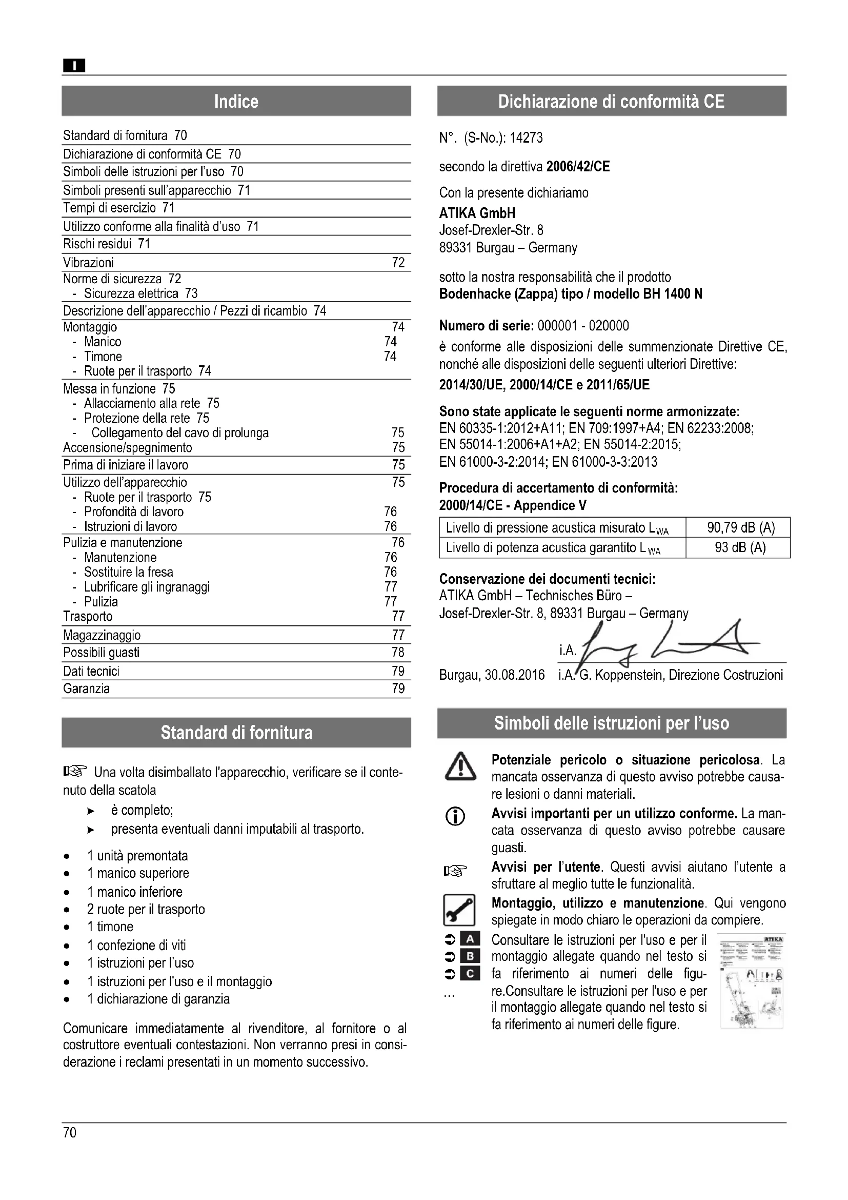sotto la nostra responsabilità che il prodotto Bodenhacke (Zappa) tipo / modello BH 1400 N Numero di serie: 000001 - 020000 è conforme alle disposizioni delle summenzionate Direttive CE, nonché alle disposizioni delle seguenti ulteriori Direttive: 2014/30/UE, 2000/14/CE e 2011/65/UE Sono state applicate le seguenti norme armonizzate: EN 60335-1:2012+A11; EN 709:1997+A4; EN 62233:2008; EN 55014-1:2006+A1+A2; EN 55014-2:2015; EN 61000-3-2:2014; EN 61000-3-3:2013 Procedura di accertamento di conformità: 2000/14/CE - Appendice V Livello di pressione acustica misurato L