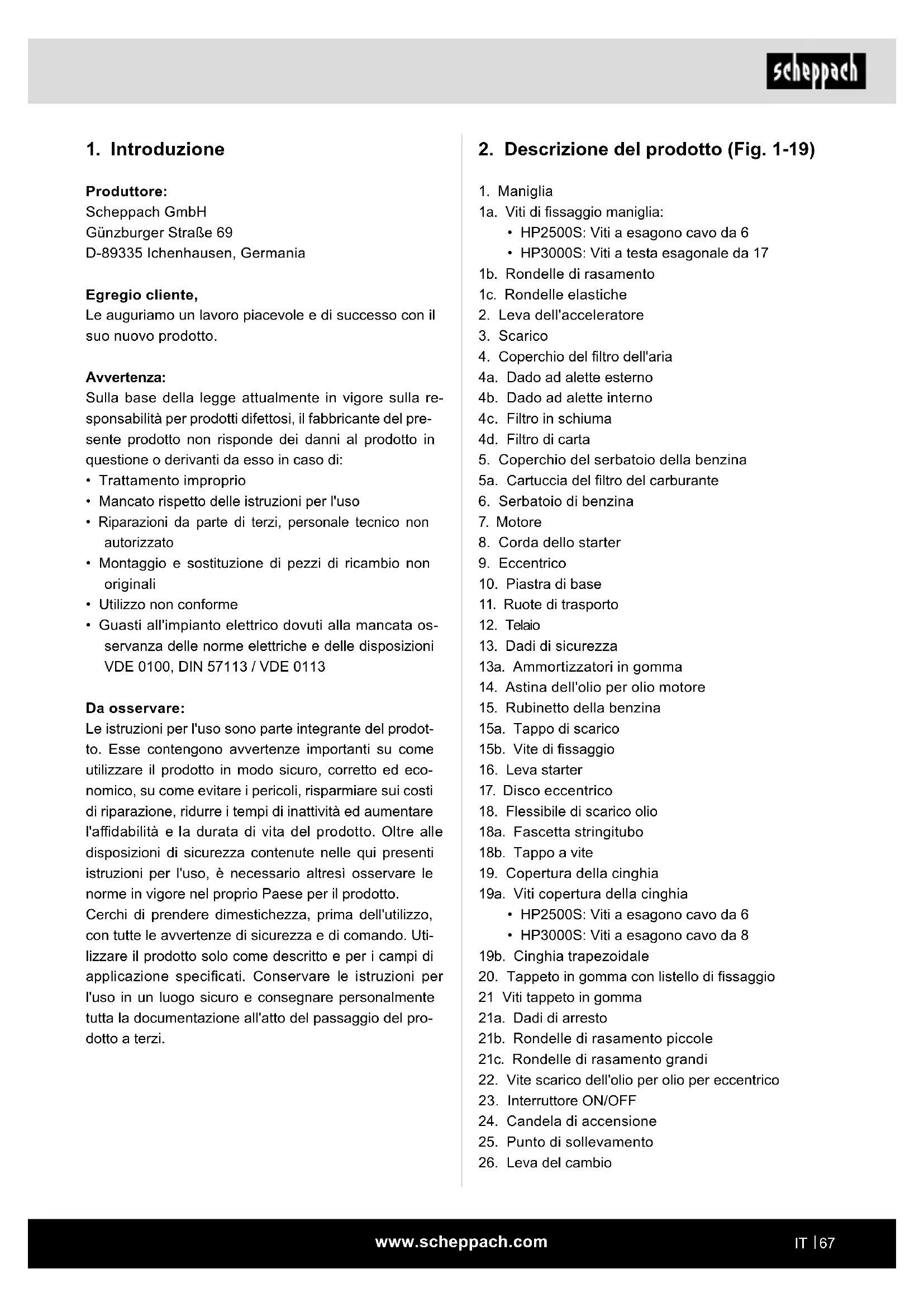 Produttore: Scheppach GmbH Günzburger Straße 69 D-89335 Ichenhausen, Germania Egregio cliente, Le auguriamo un lavoro piacevole e di successo con il suo nuovo prodotto. Avvertenza: Sulla base della legge attualmente in vigore sulla re- sponsabilità per prodotti difettosi, il fabbricante del pre- sente prodotto non risponde dei danni al prodotto in questione o derivanti da esso in caso di: