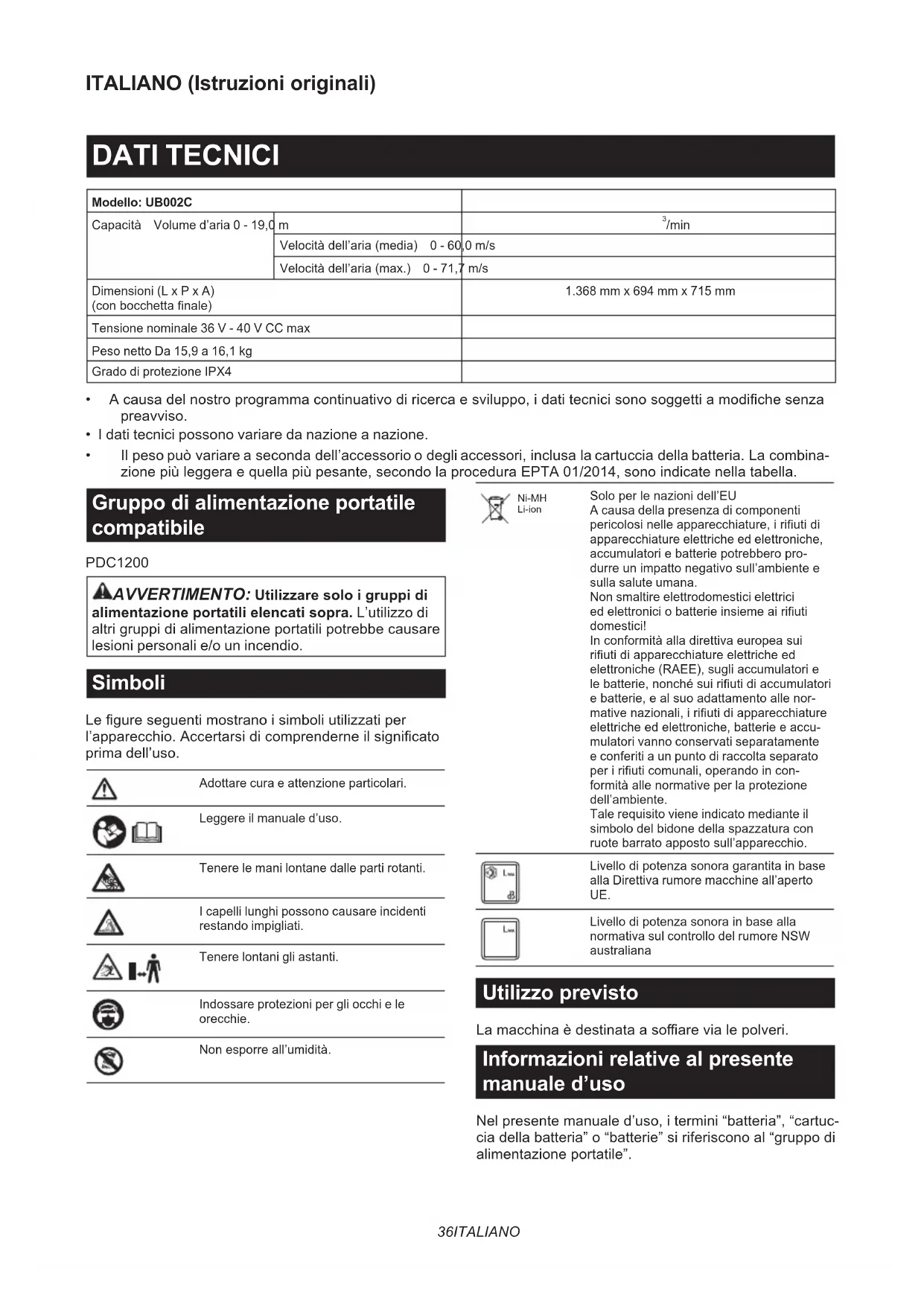 - Ilpesopuòvariareasecondadell’accessorioodegliaccessori,inclusalacartucciadellabatteria.Lacombina- zionepiùleggeraequellapiùpesante,secondolaproceduraEPTA01/2014,sonoindicatenellatabella. Gruppo di alimentazione portatile compatibile PDC1200 AVVERTIMENTO: Utilizzare solo i gruppi di alimentazione portatili elencati sopra. L’utilizzo di altrigruppidialimentazioneportatilipotrebbecausare lesioni personali e/o un incendio. Simboli Legureseguentimostranoisimboliutilizzatiper l’apparecchio.Accertarsidicomprenderneilsignicato prima dell’uso. Adottare cura e attenzione particolari. Leggere il manuale d’uso. Tenere le mani lontane dalle parti rotanti. I capelli lunghi possono causare incidenti restando impigliati. Tenere lontani gli astanti. Indossare protezioni per gli occhi e le orecchie. Nonesporreall’umidità. Ni-MH Li-ion Soloperlenazionidell’EU A causa della presenza di componenti pericolosinelleapparecchiature,iriutidi apparecchiature elettriche ed elettroniche, accumulatoriebatteriepotrebberopro- durreunimpattonegativosull’ambientee sulla salute umana. Non smaltire elettrodomestici elettrici edelettroniciobatterieinsiemeairiuti domestici! Inconformitàalladirettivaeuropeasui riutidiapparecchiatureelettricheed elettroniche(RAEE),sugliaccumulatorie lebatterie,nonchésuiriutidiaccumulatori ebatterie,ealsuoadattamentoallenor- mativenazionali,iriutidiapparecchiature elettricheedelettroniche,batterieeaccu- mulatori vanno conservati separatamente e conferiti a un punto di raccolta separato peririuticomunali,operandoincon- formitàallenormativeperlaprotezione dell’ambiente. Tale requisito viene indicato mediante il simbolodelbidonedellaspazzaturacon ruotebarratoappostosull’apparecchio. Livellodipotenzasonoragarantitainbase alla Direttiva rumore macchine all’aperto UE. Livellodipotenzasonorainbasealla normativa sul controllo del rumore NSW australiana Utilizzo previsto Lamacchinaèdestinataasoarevialepolveri. Informazioni relative al presente manuale d’uso Nelpresentemanualed’uso,itermini“batteria”,“cartuc- ciadellabatteria”o“batterie”siriferisconoal“gruppodi alimentazioneportatile”.37 ITALIANO Rumore LivellotipicodirumorepesatoAdeterminatoinbase allostandardEN50636-2-100: Livello di pressione sonora (L