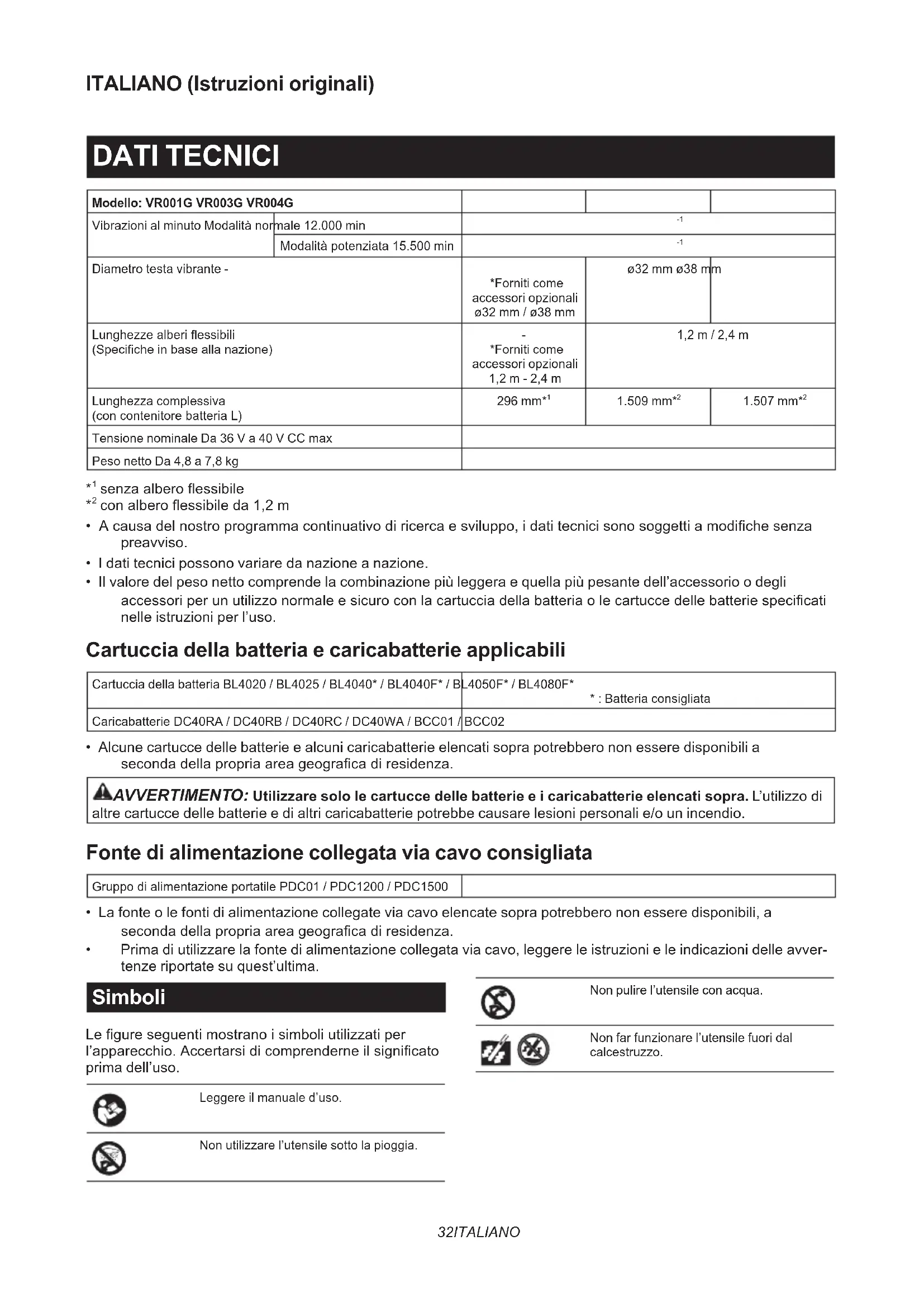 - Prima di utilizzare la fonte di alimentazione collegata via cavo, leggere le istruzioni e le indicazioni delle avver- tenze riportate su quest’ultima. Simboli Le gure seguenti mostrano i simboli utilizzati per l’apparecchio. Accertarsi di comprenderne il signicato prima dell’uso. Leggere il manuale d’uso. Non utilizzare l’utensile sotto la pioggia. Non pulire l’utensile con acqua. Non far funzionare l’utensile fuori dal calcestruzzo.33 ITALIANO Ni-MH Li-ion Solo per le nazioni dell’EU A causa della presenza di componenti pericolosi nelle apparecchiature, i riuti di apparecchiature elettriche ed elettroniche, accumulatori e batterie potrebbero pro- durre un impatto negativo sull’ambiente e sulla salute umana. Non smaltire elettrodomestici elettrici ed elettronici o batterie insieme ai riuti domestici! In conformità alla direttiva europea sui riuti di apparecchiature elettriche ed elettroniche (RAEE), sugli accumulatori e le batterie, nonché sui riuti di accumulatori e batterie, e al suo adattamento alle nor- mative nazionali, i riuti di apparecchiature elettriche ed elettroniche, batterie e accu- mulatori vanno conservati separatamente e conferiti a un punto di raccolta separato per i riuti comunali, operando in con- formità alle normative per la protezione dell’ambiente. Tale requisito viene indicato mediante il simbolo del bidone della spazzatura con ruote barrato apposto sull’apparecchio. Uso previsto L’utensile è destinato alla rimozione di bolle d’aria dal calcestruzzo durante il getto del calcestruzzo. Rumore Livello tipico di rumore pesato A determinato in base allo standard ENIEC62841-2-12: Modello VR001G Livello di pressione sonora (L