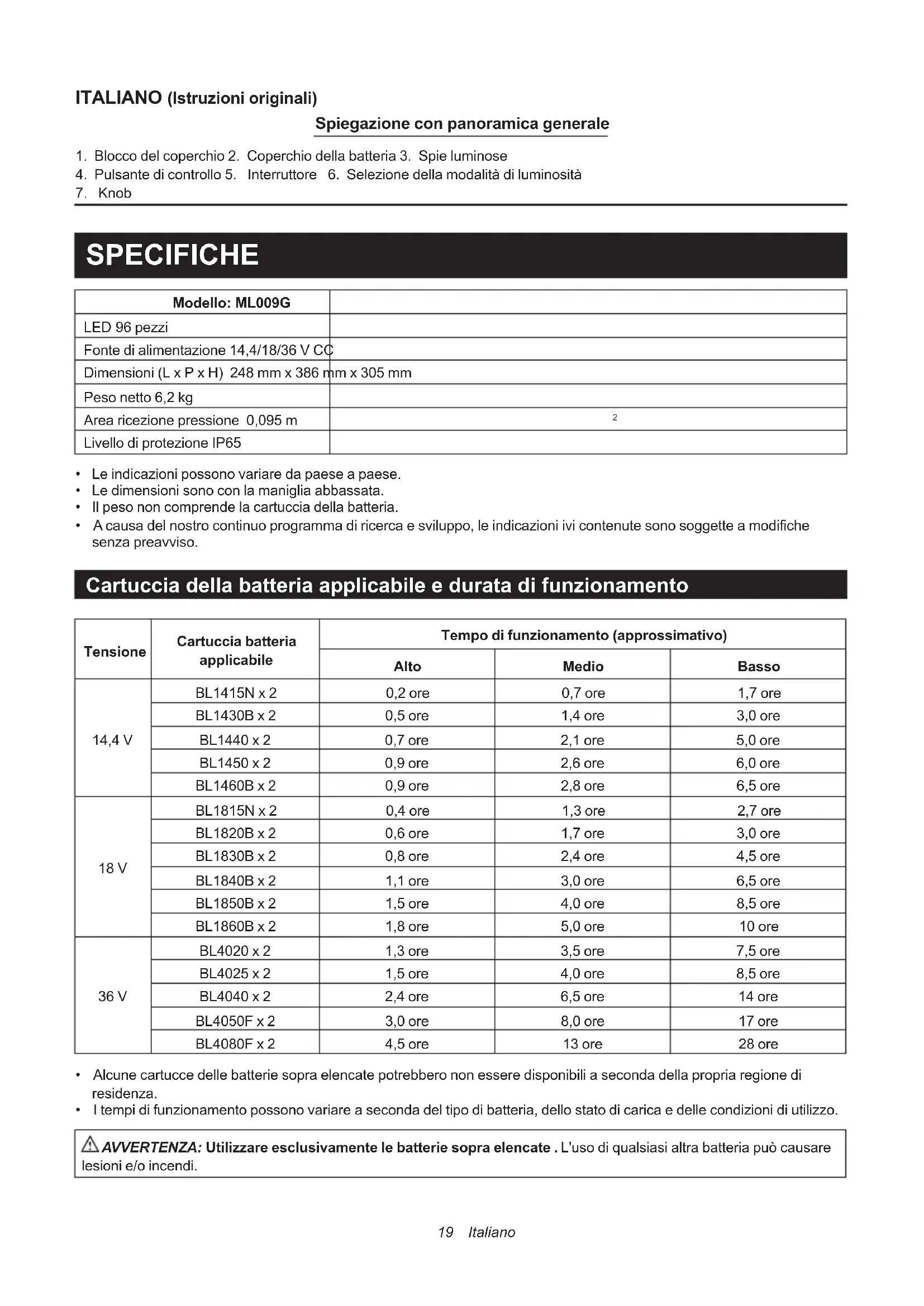- A causa del nostro continuo programma di ricerca e sviluppo, le indicazioni ivi contenute sono soggette a modifiche senza preavviso. Cartuccia della batteria applicabile e durata di funzionamento Tensione Cartuccia batteria applicabile Tempo di funzionamento (approssimativo) Alto Medio Basso 14,4 V BL1415N x 2 0,2 ore 0,7 ore 1,7 ore BL1430B x 2 0,5 ore 1,4 ore 3,0 ore BL1440 x 2 0,7 ore 2,1 ore 5,0 ore BL1450 x 2 0,9 ore 2,6 ore 6,0 ore BL1460B x 2 0,9 ore 2,8 ore 6,5 ore 18 V BL1815N x 2 0,4 ore 1,3 ore 2,7 ore BL1820B x 2 0,6 ore 1,7 ore 3,0 ore BL1830B x 2 0,8 ore 2,4 ore 4,5 ore BL1840B x 2 1,1 ore 3,0 ore 6,5 ore BL1850B x 2 1,5 ore 4,0 ore 8,5 ore BL1860B x 2 1,8 ore 5,0 ore 10 ore 36 V BL4020 x 2 1,3 ore 3,5 ore 7,5 ore BL4025 x 2 1,5 ore 4,0 ore 8,5 ore BL4040 x 2 2,4 ore 6,5 ore 14 ore BL4050F x 2 3,0 ore 8,0 ore 17 ore BL4080F x 2 4,5 ore 13 ore 28 ore