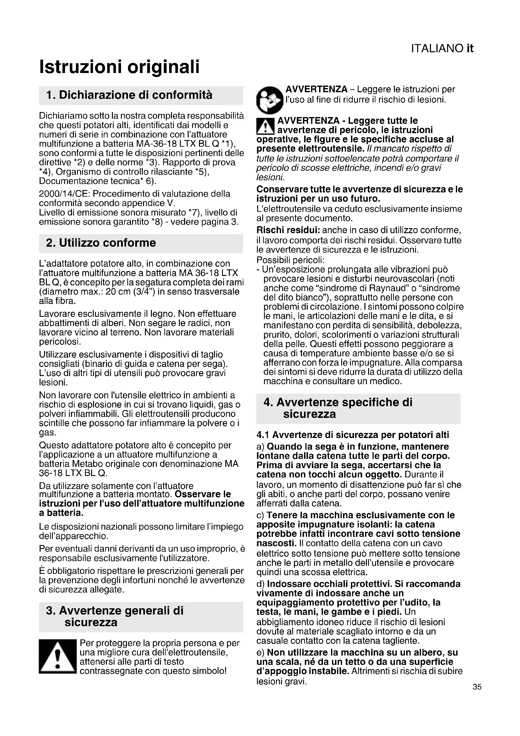Istruzioni originali Dichiariamo sotto la nostra completa responsabilità che questi potatori alti, identificati dai modelli e numeri di serie in combinazione con l’attuatore multifunzione a batteria MA-36-18 LTX BL Q *1), sono conformi a tutte le disposizioni pertinenti delle direttive *2) e delle norme *3). Rapporto di prova *4), Organismo di controllo rilasciante *5), Documentazione tecnica* 6). 2000/14/CE: Procedimento di valutazione della conformità secondo appendice V. Livello di emissione sonora misurato *7), livello di emissione sonora garantito *8) - vedere pagina 3. L’adattatore potatore alto, in combinazione con l’attuatore multifunzione a batteria MA 36-18 LTX BL Q, è concepito per la segatura completa dei rami (diametro max.: 20 cm (3/4”) in senso trasversale alla fibra. Lavorare esclusivamente il legno. Non effettuare abbattimenti di alberi. Non segare le radici, non lavorare vicino al terreno. Non lavorare materiali pericolosi. Utilizzare esclusivamente i dispositivi di taglio consigliati (binario di guida e catena per sega). L’uso di altri tipi di utensili può provocare gravi lesioni. Non lavorare con l'utensile elettrico in ambienti a rischio di esplosione in cui si trovano liquidi, gas o polveri infiammabili. Gli elettroutensili producono scintille che possono far infiammare la polvere o i gas. Questo adattatore potatore alto è concepito per l’applicazione a un attuatore multifunzione a batteria Metabo originale con denominazione MA 36-18 LTX BL Q. Da utilizzare solamente con l’attuatore multifunzione a batteria montato. Osservare le istruzioni per l'uso dell’attuatore multifunzione a batteria. Le disposizioni nazionali possono limitare l’impiego dell’apparecchio. Per eventuali danni derivanti da un uso improprio, è responsabile esclusivamente l'utilizzatore. È obbligatorio rispettare le prescrizioni generali per la prevenzione degli infortuni nonché le avvertenze di sicurezza allegate. Per proteggere la propria persona e per una migliore cura dell'elettroutensile, attenersi alle parti di testo contrassegnate con questo simbolo! AVVERTENZA – Leggere le istruzioni per l’uso al fine di ridurre il rischio di lesioni. AVVERTENZA - Leggere tutte le avvertenze di pericolo, le istruzioni operative, le figure e le specifiche accluse al presente elettroutensile. Il mancato rispetto di tutte le istruzioni sottoelencate potrà comportare il pericolo di scosse elettriche, incendi e/o gravi lesioni. Conservare tutte le avvertenze di sicurezza e le istruzioni per un uso futuro. L'elettroutensile va ceduto esclusivamente insieme al presente documento. Rischi residui: anche in caso di utilizzo conforme, il lavoro comporta dei rischi residui. Osservare tutte le avvertenze di sicurezza e le istruzioni. Possibili pericoli: - Un’esposizione prolungata alle vibrazioni può provocare lesioni e disturbi neurovascolari (noti anche come “sindrome di Raynaud” o “sindrome del dito bianco”), soprattutto nelle persone con problemi di circolazione. I sintomi possono colpire le mani, le articolazioni delle mani e le dita, e si manifestano con perdita di sensibilità, debolezza, prurito, dolori, scolorimenti o variazioni strutturali della pelle. Questi effetti possono peggiorare a causa di temperature ambiente basse e/o se si afferrano con forza le impugnature. Alla comparsa dei sintomi si deve ridurre la durata di utilizzo della macchina e consultare un medico.