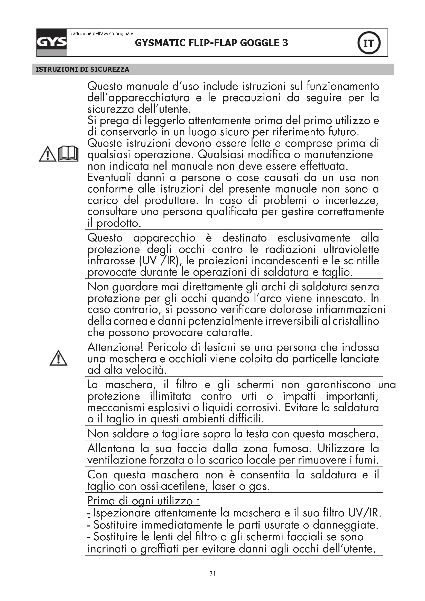 Questo manuale d’uso include istruzioni sul funzionamento dell’apparecchiatura e le precauzioni da seguire per la sicurezza dell’utente. Si prega di leggerlo attentamente prima del primo utilizzo e di conservarlo in un luogo sicuro per riferimento futuro. Queste istruzioni devono essere lette e comprese prima di qualsiasi operazione. Qualsiasi modica o manutenzione non indicata nel manuale non deve essere effettuata. Eventuali danni a persone o cose causati da un uso non conforme alle istruzioni del presente manuale non sono a carico del produttore. In caso di problemi o incertezze, consultare una persona qualicata per gestire correttamente il prodotto. Questo apparecchio è destinato esclusivamente alla protezione degli occhi contro le radiazioni ultraviolette infrarosse (UV /IR), le proiezioni incandescenti e le scintille provocate durante le operazioni di saldatura e taglio. Non guardare mai direttamente gli archi di saldatura senza protezione per gli occhi quando l’arco viene innescato. In caso contrario, si possono vericare dolorose inammazioni della cornea e danni potenzialmente irreversibili al cristallino che possono provocare cataratte. Attenzione! Pericolo di lesioni se una persona che indossa una maschera e occhiali viene colpita da particelle lanciate ad alta velocità. La maschera, il ltro e gli schermi non garantiscono una protezione illimitata contro urti o impatti importanti, meccanismi esplosivi o liquidi corrosivi. Evitare la saldatura o il taglio in questi ambienti difcili. Non saldare o tagliare sopra la testa con questa maschera. Allontana la sua faccia dalla zona fumosa. Utilizzare la ventilazione forzata o lo scarico locale per rimuovere i fumi. Con questa maschera non è consentita la saldatura e il taglio con ossi-acetilene, laser o gas. Prima di ogni utilizzo : - Ispezionare attentamente la maschera e il suo ltro UV/IR. - Sostituire immediatamente le parti usurate o danneggiate. - Sostituire le lenti del ltro o gli schermi facciali se sono incrinati o grafati per evitare danni agli occhi dell’utente.GYSMATIC FLIP-FLAP GOGGLE 3