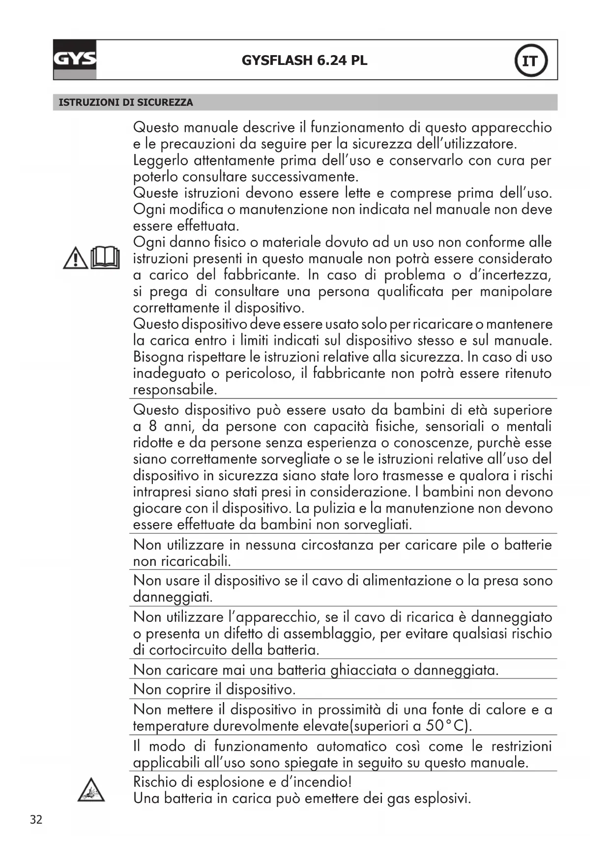 Questo manuale descrive il funzionamento di questo apparecchio e le precauzioni da seguire per la sicurezza dell’utilizzatore. Leggerlo attentamente prima dell’uso e conservarlo con cura per poterlo consultare successivamente. Queste istruzioni devono essere lette e comprese prima dell’uso. Ogni modifica o manutenzione non indicata nel manuale non deve essere effettuata. Ogni danno fisico o materiale dovuto ad un uso non conforme alle istruzioni presenti in questo manuale non potrà essere considerato a carico del fabbricante. In caso di problema o d’incertezza, si prega di consultare una persona qualificata per manipolare correttamente il dispositivo. Questo dispositivo deve essere usato solo per ricaricare o mantenere la carica entro i limiti indicati sul dispositivo stesso e sul manuale. Bisogna rispettare le istruzioni relative alla sicurezza. In caso di uso inadeguato o pericoloso, il fabbricante non potrà essere ritenuto responsabile. Questo dispositivo può essere usato da bambini di età superiore a 8 anni, da persone con capacità fisiche, sensoriali o mentali ridotte e da persone senza esperienza o conoscenze, purchè esse siano correttamente sorvegliate o se le istruzioni relative all’uso del dispositivo in sicurezza siano state loro trasmesse e qualora i rischi intrapresi siano stati presi in considerazione. I bambini non devono giocare con il dispositivo. La pulizia e la manutenzione non devono essere effettuate da bambini non sorvegliati. Non utilizzare in nessuna circostanza per caricare pile o batterie non ricaricabili. Non usare il dispositivo se il cavo di alimentazione o la presa sono danneggiati. Non utilizzare l’apparecchio, se il cavo di ricarica è danneggiato o presenta un difetto di assemblaggio, per evitare qualsiasi rischio di cortocircuito della batteria. Non caricare mai una batteria ghiacciata o danneggiata. Non coprire il dispositivo. Non mettere il dispositivo in prossimità di una fonte di calore e a temperature durevolmente elevate(superiori a 50°C). Il modo di funzionamento automatico così come le restrizioni applicabili all’uso sono spiegate in seguito su questo manuale. Rischio di esplosione e d’incendio! Una batteria in carica può emettere dei gas esplosivi. IT33 GYSFLASH 6.24 PL