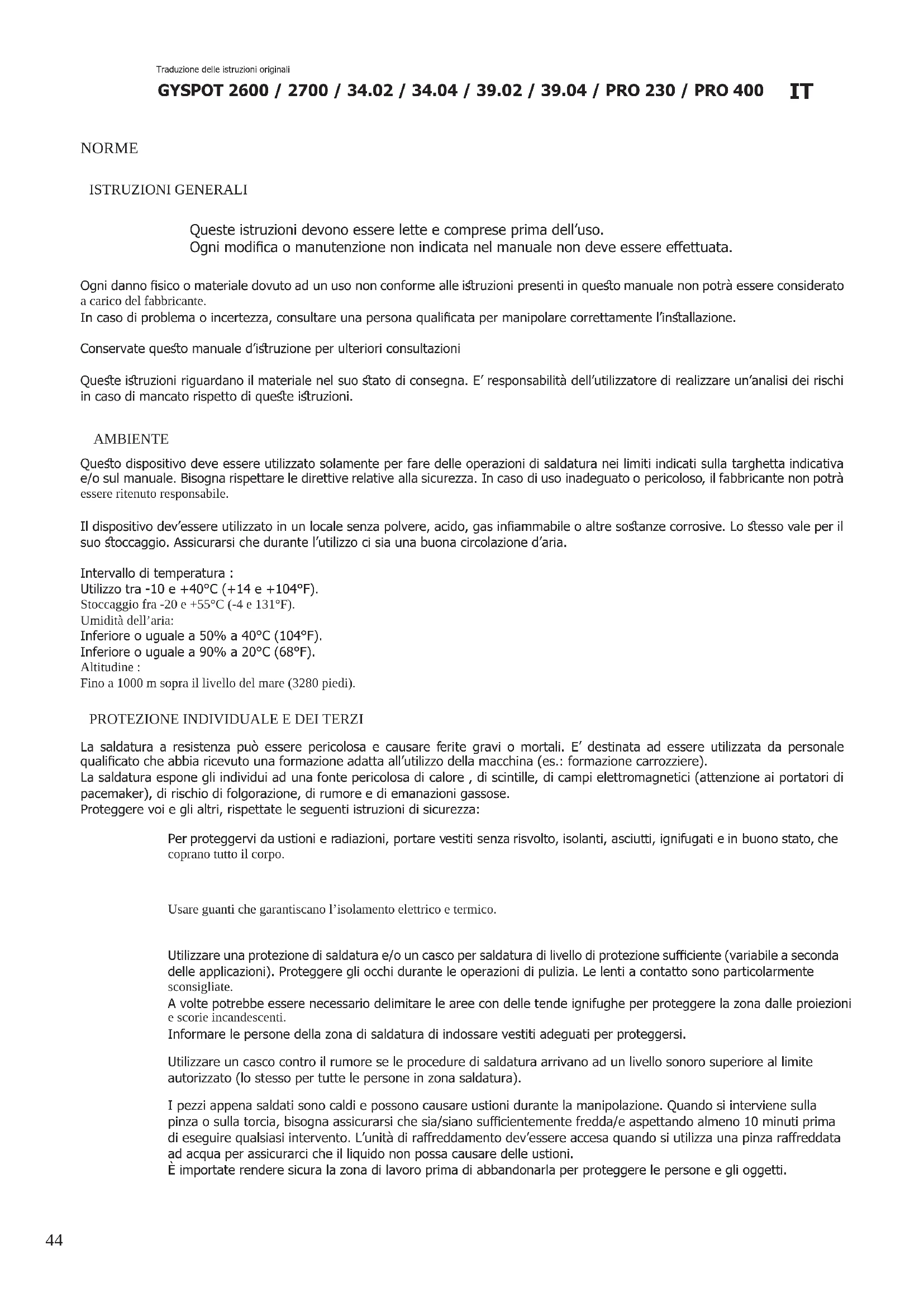 Questo dispositivo deve essere utilizzato solamente per fare delle operazioni di saldatura nei limiti indicati sulla targhettaindicativa e/o sul manuale. Bisogna rispetto le direttive relative alla sicurezza. In caso di uso inadeguato o pericoloso, il fabbricante non potra essere ritenuto responsable.