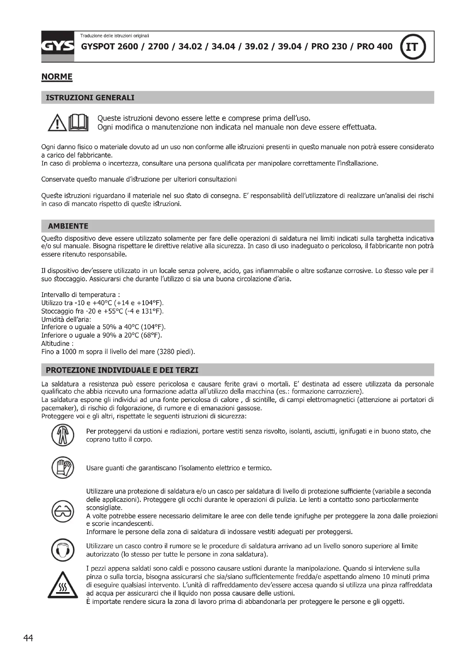 Questo materiale di Classe A non è fatto per essere usato in una zona residenziale dove la corrente elettrica è fornita dal sistema pubblico di alimentazione a basa tensione. Potrebbero esserci dicoltà potenziali per assicurare la compatibilità elettromagnetica in questi siti, a causa delle perturbazioni condotte o irradiate. GYSPOT2600 / 2700 / 34.04 / 39.04 / PRO 400 Questo materiale è conforme alla CEI 61000-3-11 se l’impedenza della rete al punto di raccordo con l’installazione elettrica è inferiore all’impedenza massima ammissibile della rete Zmax = 0,77 Ohms. GYSPOT34.02 / 39.02 /PRO 230 Questo materiale è conforme alla CEI 61000-3-11 se l’impedenza della rete al punto di raccordo con l’installazione elettrica è inferiore all’impedenza massima ammissibile della rete Zmax = 0,84 Ohms. Questo materiale non è conforme alla CEI 61000-3-12 ed è destinato ad essere collegato alle reti private di bassa tensione collegate a loro volta alla rete pubblica di alimentazione soltanto a livello di media e alta tensione. Se è collegato al sistema pubblico di alimentazione di bassa tensione, è di responsabilità dell’installatore o dell’utilizzatore del materiale di assicurarsi, consultando l’operatore della rete pubblica di distribuzione, che il materiale possa essere collegato ad esso. EMISSIONI ELETTRO-MAGNETICHE La corrente elettrica che attraversa un qualsiasi conduttore produce dei campi elettrici e magnetici (EMF) localizzati. La corrente di saldatura produce un campo elettromagnetico attorno al circuito di saldatura e al dispositivo di saldatura. I campi elettromagnetici EMF possono diurbare alcuni impianti medici, per esempio i pacemaker. Devono essere attuate delle misure di protezione per le persone che portano impianti medici. Per esempio, rerizioni d’accesso per i passanti o una valutazione del rischio individuale per i saldatori.Traduzione delle istruzioni originali