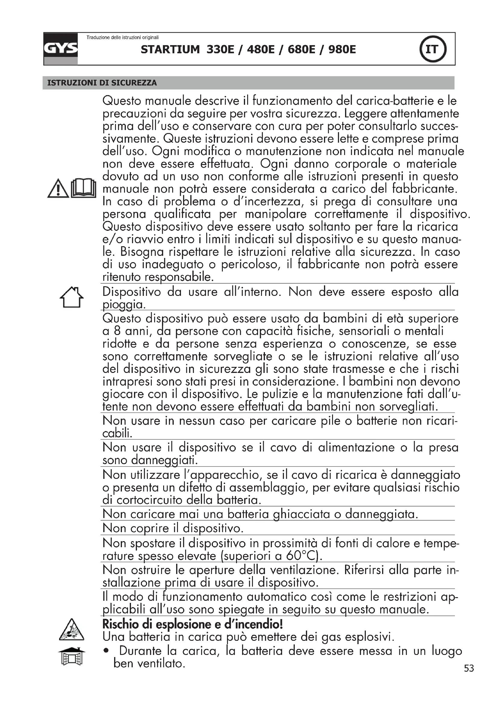 Questo manuale descrive il funzionamento del carica-batterie e le precauzioni da seguire per vostra sicurezza. Leggere attentamente prima dell’uso e conservare con cura per poter consultarlo succes- sivamente. Queste istruzioni devono essere lette e comprese prima dell’uso. Ogni modica o manutenzione non indicata nel manuale non deve essere effettuata. Ogni danno corporale o materiale dovuto ad un uso non conforme alle istruzioni presenti in questo manuale non potrà essere considerata a carico del fabbricante. In caso di problema o d’incertezza, si prega di consultare una persona qualicata per manipolare correttamente il dispositivo. Questo dispositivo deve essere usato soltanto per fare la ricarica e/o riavvio entro i limiti indicati sul dispositivo e su questo manua- le. Bisogna rispettare le istruzioni relative alla sicurezza. In caso di uso inadeguato o pericoloso, il fabbricante non potrà essere ritenuto responsabile. Dispositivo da usare all’interno. Non deve essere esposto alla pioggia. Questo dispositivo può essere usato da bambini di età superiore a 8 anni, da persone con capacità siche, sensoriali o mentali ridotte e da persone senza esperienza o conoscenze, se esse sono correttamente sorvegliate o se le istruzioni relative all’uso del dispositivo in sicurezza gli sono state trasmesse e che i rischi intrapresi sono stati presi in considerazione. I bambini non devono giocare con il dispositivo. Le pulizie e la manutenzione fati dall’u- tente non devono essere effettuati da bambini non sorvegliati. Non usare in nessun caso per caricare pile o batterie non ricari- cabili. Non usare il dispositivo se il cavo di alimentazione o la presa sono danneggiati. Non utilizzare l’apparecchio, se il cavo di ricarica è danneggiato o presenta un difetto di assemblaggio, per evitare qualsiasi rischio di cortocircuito della batteria. Non caricare mai una batteria ghiacciata o danneggiata. Non coprire il dispositivo. Non spostare il dispositivo in prossimità di fonti di calore e tempe- rature spesso elevate (superiori a 60°C). Non ostruire le aperture della ventilazione. Riferirsi alla parte in- stallazione prima di usare il dispositivo. Il modo di funzionamento automatico così come le restrizioni ap- plicabili all’uso sono spiegate in seguito su questo manuale. Rischio di esplosione e d’incendio! Una batteria in carica può emettere dei gas esplosivi.