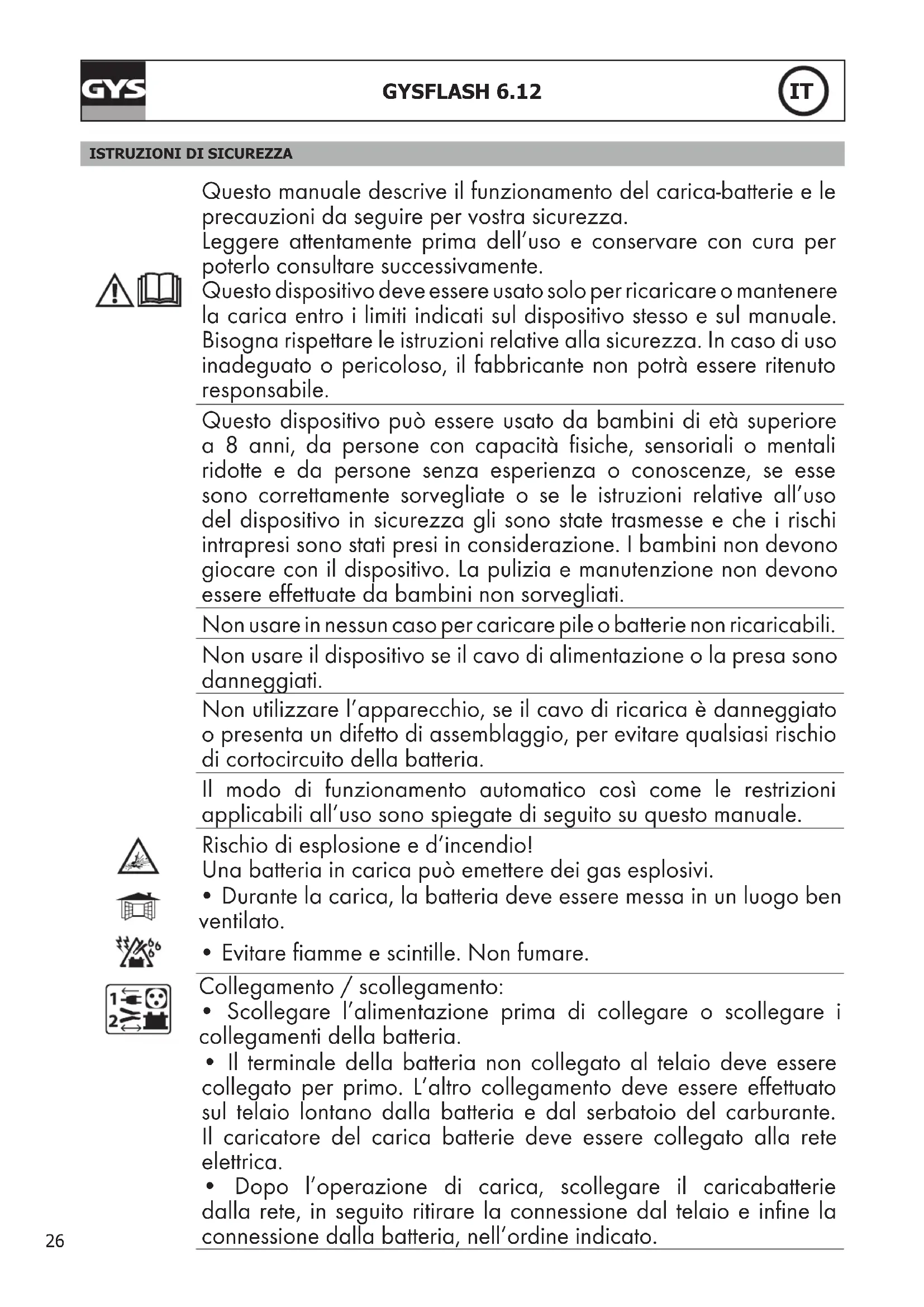 - Questo materiale è soggetto alla raccolta differenziata. Non deve essere smaltito con i rifiuti domestici. DESCRIZIONE GENERALE Il GYSFLASH 6.12 è ideale per caricare la maggior parte delle batterie al piombo-acido, solitamente usate per auto e molti altri tipi di veicoli. Queste batterie possono essere di molti tipi es.: GEL (gel elettrolita), AGM (absorbed glass mat), WET, MF (Maintenance Free), CA (Calcio)... Questo caricabatterie è stato disegnato per caricare batterie a 12V (6*2V elements) da 1.2 Ah a 125 Ah, o per il mantenimento di batterie no 170 Ah. AVVIAMENTO 1. Collegare il caricabatterie alla batteria all’uso dell’accessorio desiderato (morsetti, connettori a occhiello, ecc.). 2. Collegare il caricabatterie alla presa (rere monofase 220-240Vac 50-60Hz). 3. Scegliere il modo premendo sul tasto . Dopo circa cinque secondi, la carica si avvia automaticamente.4. Durante la carica, il dispositivo indica lo stato di avanzamento della carica. Quando la spia lampeggia, la batteria è pronta ad avviare il motore. E quando la spia rimane accesa, la batteria è completamente carica.5. La carica può essere interrotta ad ogni momento scollegando la spina dalla presa oppure premendo sul tasto