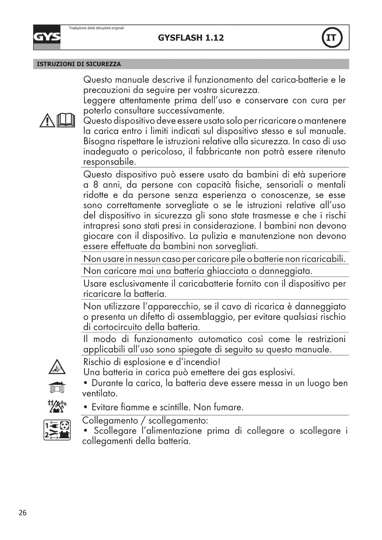 Questo manuale descrive il funzionamento del carica-batterie e le precauzioni da seguire per vostra sicurezza. Leggere attentamente prima dell’uso e conservare con cura per poterlo consultare successivamente. Questo dispositivo deve essere usato solo per ricaricare o mantenere la carica entro i limiti indicati sul dispositivo stesso e sul manuale. Bisogna rispettare le istruzioni relative alla sicurezza. In caso di uso inadeguato o pericoloso, il fabbricante non potrà essere ritenuto responsabile. Questo dispositivo può essere usato da bambini di età superiore a 8 anni, da persone con capacità fisiche, sensoriali o mentali ridotte e da persone senza esperienza o conoscenze, se esse sono correttamente sorvegliate o se le istruzioni relative all’uso del dispositivo in sicurezza gli sono state trasmesse e che i rischi intrapresi sono stati presi in considerazione. I bambini non devono giocare con il dispositivo. La pulizia e manutenzione non devono essere effettuate da bambini non sorvegliati. Non usare in nessun caso per caricare pile o batterie non ricaricabili. Non caricare mai una batteria ghiacciata o danneggiata. Usare esclusivamente il caricabatterie fornito con il dispositivo per ricaricare la batteria. Non utilizzare l’apparecchio, se il cavo di ricarica è danneggiato o presenta un difetto di assemblaggio, per evitare qualsiasi rischio di cortocircuito della batteria. Il modo di funzionamento automatico così come le restrizioni applicabili all’uso sono spiegate di seguito su questo manuale. Rischio di esplosione e d’incendio! Una batteria in carica può emettere dei gas esplosivi.