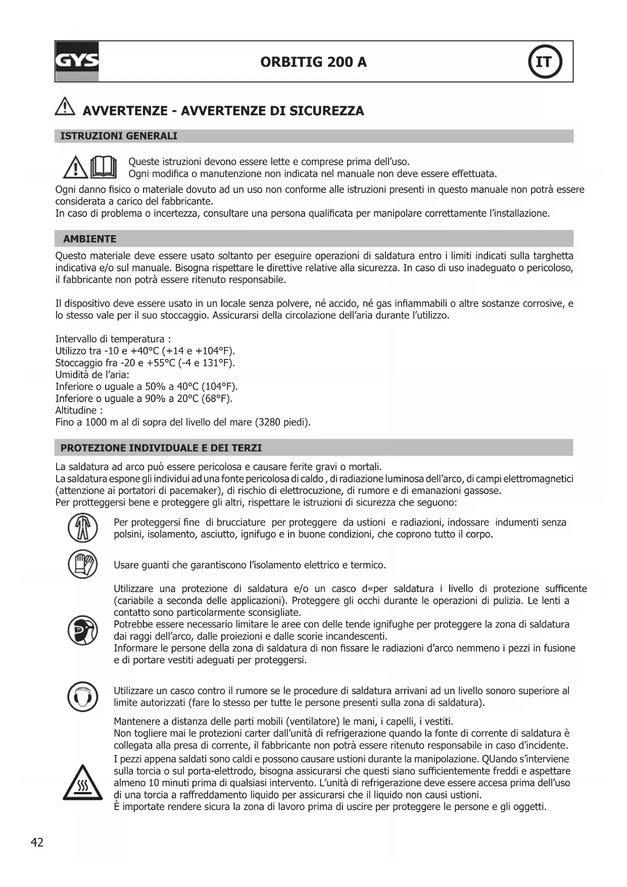 La saldatura ad arco può essere pericolosa e causare ferite gravi o mortali. La saldatura espone gli individui ad una fonte pericolosa di caldo , di radiazione luminosa dell’arco, di campi elettromagnetici (attenzione ai portatori di pacemaker), di rischio di elettrocuzione, di rumore e di emanazioni gassose. Per protteggersi bene e proteggere gli altri, rispettare le istruzioni di sicurezza che seguono: Per proteggersi ne di brucciature per proteggere da ustioni e radiazioni, indossare indumenti senza polsini, isolamento, asciutto, ignifugo e in buone condizioni, che coprono tutto il corpo. Usare guanti che garantiscono l’isolamento elettrico e termico. Utilizzare una protezione di saldatura e/o un casco d«per saldatura i livello di protezione sucente (cariabile a seconda delle applicazioni). Proteggere gli occhi durante le operazioni di pulizia. Le lenti a contatto sono particolarmente sconsigliate. Potrebbe essere necessario limitare le aree con delle tende ignifughe per proteggere la zona di saldatura dai raggi dell’arco, dalle proiezioni e dalle scorie incandescenti. Informare le persone della zona di saldatura di non ssare le radiazioni d’arco nemmeno i pezzi in fusione e di portare vestiti adeguati per proteggersi. Utilizzare un casco contro il rumore se le procedure di saldatura arrivani ad un livello sonoro superiore al limite autorizzati (fare lo stesso per tutte le persone presenti sulla zona di saldatura). Mantenere a distanza delle parti mobili (ventilatore) le mani, i capelli, i vestiti. Non togliere mai le protezioni carter dall’unità di refrigerazione quando la fonte di corrente di saldatura è collegata alla presa di corrente, il fabbricante non potrà essere ritenuto responsabile in caso d’incidente. I pezzi appena saldati sono caldi e possono causare ustioni durante la manipolazione. QUando s’interviene sulla torcia o sul porta-elettrodo, bisogna assicurarsi che questi siano sucientemente freddi e aspettare almeno 10 minuti prima di qualsiasi intervento. L’unità di refrigerazione deve essere accesa prima dell’uso di una torcia a rareddamento liquido per assicurarsi che il liquido non causi ustioni. È importate rendere sicura la zona di lavoro prima di uscire per proteggere le persone e gli oggetti.43 ORBITIG 200 A