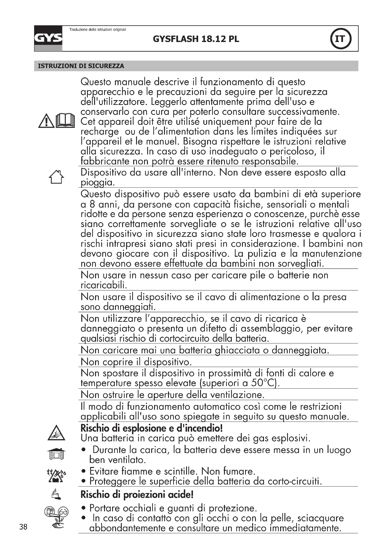 - In caso di contatto con gli occhi o con la pelle, sciacquare abbondantemente e consultare un medico immediatamente.39 GYSFLASH 18.12 PL Traduzione delle istruzioni originali