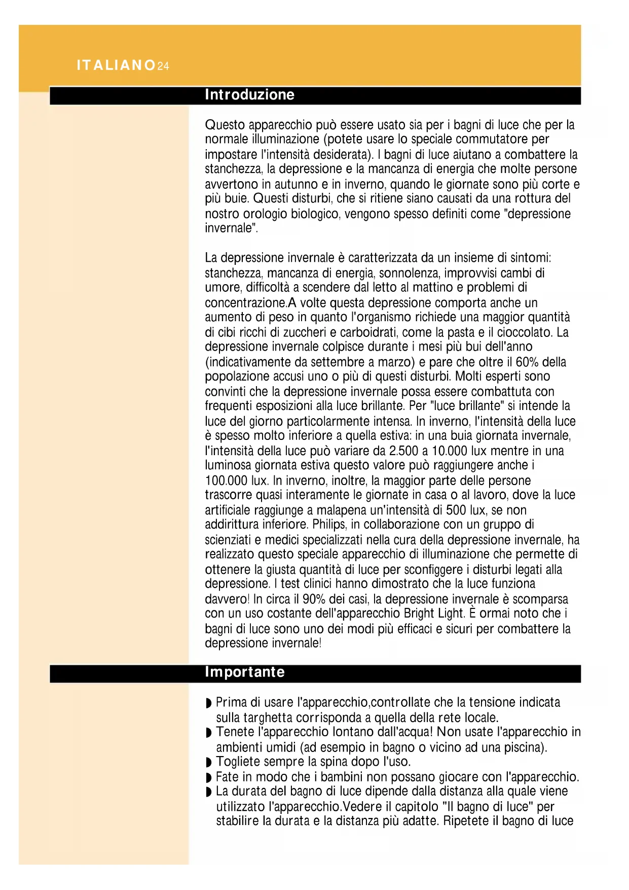 trascorre quasi interamente le giornate in casa o al lavoro, dove la luce artificiale raggiunge a malapena un'intensità di 500 lux, se non addirittura inferiore. Philips, in collaborazione con un gruppo di scienziati e medici specializzati nella cura della depressione invernale, ha realizzato questo speciale apparecchio di illuminazione che permette di ottenere la giusta quantità di luce per sconfiggere i disturbi legati alla depressione. I test clinici hanno dimostrato che la luce funziona davvero! In circa il 90% dei casi, la depressione invernale è scomparsa con un uso costante dell'apparecchio Bright Light. È ormai noto che i bagni di luce sono uno dei modi più efficaci e sicuri per combattere la depressione invernale! Importante ◗ Prima di usare l'apparecchio,controllate che la tensione indicata sulla targhetta corrisponda a quella della rete locale. ◗ Tenete l'apparecchio lontano dall'acqua! Non usate l'apparecchio in ambienti umidi (ad esempio in bagno o vicino ad una piscina). ◗ Togliete sempre la spina dopo l'uso. ◗ Fate in modo che i bambini non possano giocare con l'apparecchio. ◗ La durata del bagno di luce dipende dalla distanza alla quale viene utilizzato l'apparecchio.Vedere il capitolo "Il bagno di luce" per stabilire la durata e la distanza più adatte. Ripetete il bagno di luce ITALIANO24per almeno cinque giorni consecutivi (trovate un orario adatto alle vostre esigenze e fate in modo che diventi una piacevole abitudine). Potete iniziare una serie di bagni di luce (per 5 o più giorni consecutivi) ogni volta che ne avvertite l'esigenza. ◗ Utilizzate la luce di questo apparecchio in aggiunta alla luce normalmente utilizzata in casa (luce del sole, lampade ecc.). Non usate l'apparecchio in un locale sprovvisto di altre fonti luminose. ◗ Vi consigliamo di non fissare troppo a lungo la luce. ◗ Dopo i primi bagni di luce potreste avvertire un leggero fastidio agli occhi e/o un leggero mal di testa.Si tratta di un fenomeno del tutto normale, che scomparirà rapidamente. ◗ Prima di usare il vostro Bright Light consultate il medico: - avete sofferto di gravi casi di depressione; - siete ipersensibili alla luce (es. diabetici o epilettici); - avete disturbi agli occhi; - state assumendo farmaci (come alcuni antidepressivi, farmaci per profilassi malarica e altri); - avete la pressione alta. ◗ Se usando l'apparecchio vi sentite iperattivi, vi consigliamo di ridurre la quantità di luce. Nel caso non ci siano miglioramenti, vi consigliamo di rivolgervi al medico. ◗ Se dopo aver usato l'apparecchio vi sentite stanchi,spossati e/o soffrite di disturbi del sonno (es. insonnia), rivolgetevi al medico o allo psicoterapeuta. Come preparare l'apparecchio per l'uso 1 Appoggiate l'apparecchio su un tavolo.
