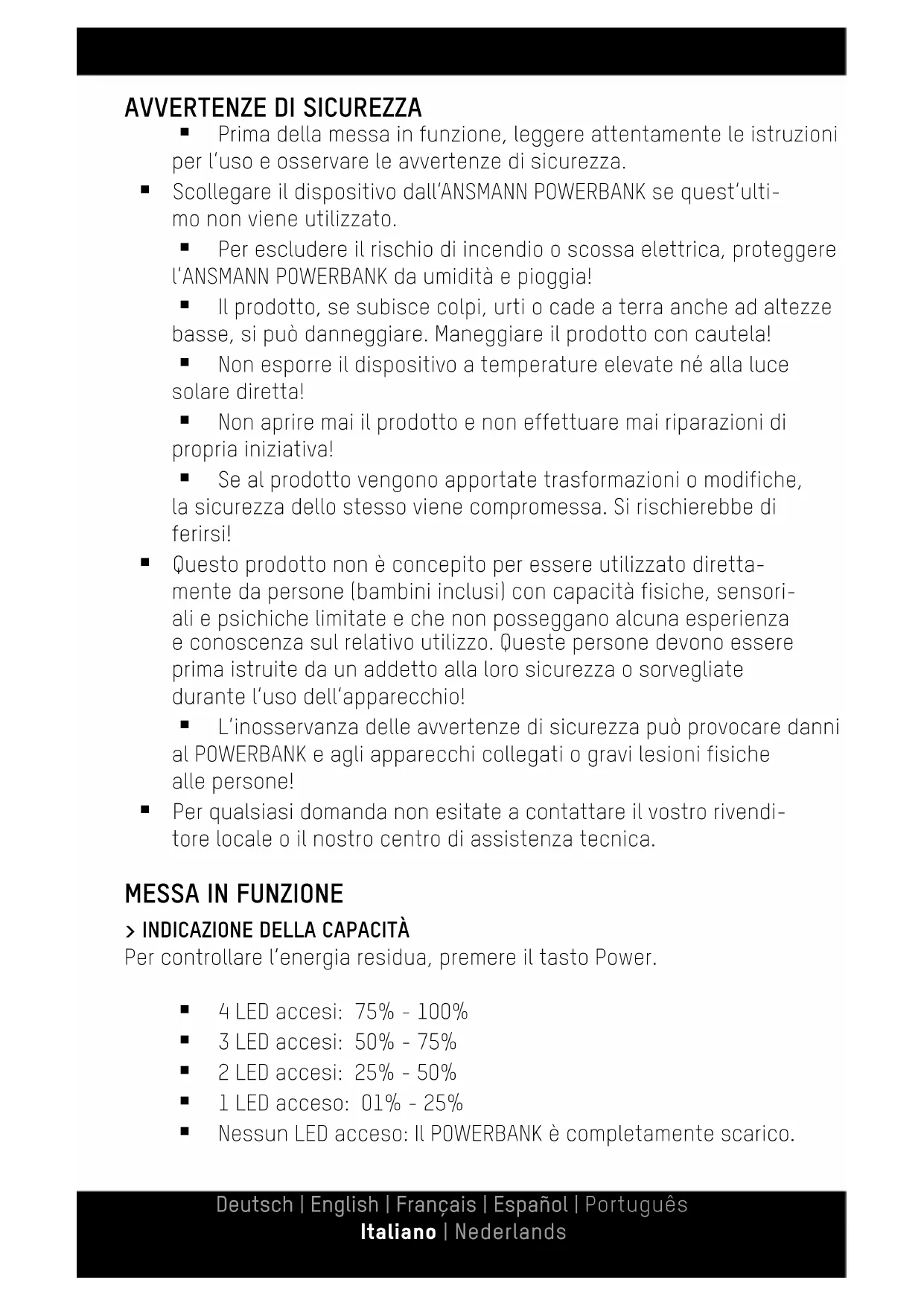 Gentile Cliente, grazie mille per aver scelto un ANSMANN POWERBANK. Le istruzioni per l‘uso vi aiutano a sfruttare al meglio le funzioni della vostra nuova batteria supplementare. Vi auguriamo buon divertimento con il vostro nuovo prodotto. Il vostro team ANSMANN Deutsch | English | Français | Español | Português Italiano | NederlandsAVVERTENZE DI SICUREZZA Prima della messa in funzione, leggere attentamente le istruzioni per l‘uso e osservare le avvertenze di sicurezza. Scollegare il dispositivo dall‘ANSMANN POWERBANK se quest‘ulti- mo non viene utilizzato. Per escludere il rischio di incendio o scossa elettrica, proteggere l‘ANSMANN POWERBANK da umidità e pioggia! Il prodotto, se subisce colpi, urti o cade a terra anche ad altezze basse, si può danneggiare. Maneggiare il prodotto con cautela! Non esporre il dispositivo a temperature elevate né alla luce solare diretta! Non aprire mai il prodotto e non effettuare mai riparazioni di propria iniziativa! Se al prodotto vengono apportate trasformazioni o modifiche, la sicurezza dello stesso viene compromessa. Si rischierebbe di ferirsi! Questo prodotto non è concepito per essere utilizzato diretta- mente da persone (bambini inclusi) con capacità fisiche, sensori- ali e psichiche limitate e che non posseggano alcuna esperienza e conoscenza sul relativo utilizzo. Queste persone devono essere prima istruite da un addetto alla loro sicurezza o sorvegliate durante l‘uso dell‘apparecchio! L‘inosservanza delle avvertenze di sicurezza può provocare danni al POWERBANK e agli apparecchi collegati o gravi lesioni fisiche alle persone! Per qualsiasi domanda non esitate a contattare il vostro rivendi- tore locale o il nostro centro di assistenza tecnica.