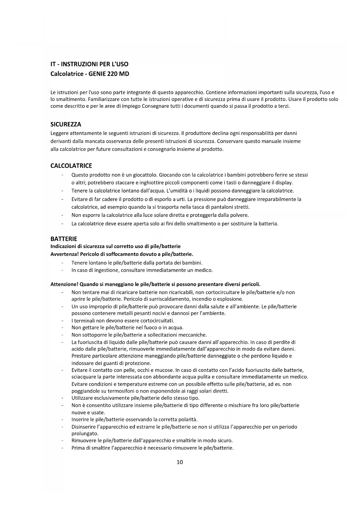 Calcolatrice - GENIE 220 MD Le istruzioni per l'uso sono parte integrante di questo apparecchio. Contiene informazioni importanti sulla sicurezza, l'uso e lo smaltimento. Familiarizzare con tutte le istruzioni operative e di sicurezza prima di usare il prodotto. Usare il prodotto solo come descritto e per le aree di impiego Consegnare tutti i documenti quando si passa il prodotto a terzi. SICUREZZA Leggere attentamente le seguenti istruzioni di sicurezza. Il produttore declina ogni responsabilità per danni derivanti dalla mancata osservanza delle presenti istruzioni di sicurezza. Conservare questo manuale insieme alla calcolatrice per future consultazioni e consegnarlo insieme al prodotto. CALCOLATRICE - Questo prodotto non è un giocattolo. Giocando con la calcolatrice i bambini potrebbero ferire se stessi o altri; potrebbero staccare e inghiottire piccoli componenti come i tasti o danneggiare il display. - Tenere la calcolatrice lontano dall'acqua. L'umidità o i liquidi possono danneggiare la calcolatrice. - Evitare di far cadere il prodotto o di esporlo a urti. La pressione può danneggiare irreparabilmente la calcolatrice, ad esempio quando la si trasporta nella tasca di pantaloni stretti. - Non esporre la calcolatrice alla luce solare diretta e proteggerla dalla polvere. - La calcolatrice deve essere aperta solo ai fini dello smaltimento o per sostituire la batteria. BATTERIE Indicazioni di sicurezza sul corretto uso di pile/batterie Avvertenza! Pericolo di soffocamento dovuto a pile/batterie. - Tenere lontano le pile/batterie dalla portata dei bambini. - In caso di ingestione, consultare immediatamente un medico. Attenzione! Quando si maneggiano le pile/batterie si possono presentare diversi pericoli. - Non tentare mai di ricaricare batterie non ricaricabili, non cortocircuitare le pile/batterie e/o non aprire le pile/batterie. Pericolo di surriscaldamento, incendio o esplosione. - Un uso improprio di pile/batterie può provocare danni dalla salute e all’ambiente. Le pile/batterie possono contenere metalli pesanti nocivi e dannosi per l’ambiente. - I terminali n on devono essere cortocircuitati. - Non gettare le pile/batterie nel fuoco o in acqua. - Non sottoporre le pile/batterie a sollecitazioni meccaniche. - La fuoriuscita di liquido dalle pile/batterie può causare danni all’apparecchio. In caso di perdite di acido dalle pile/batterie, rimuoverle immediatamente dall’apparecchio in modo da evitare danni. Prestare particolare attenzione maneggiando pile/batterie danneggiate o che perdono liquido e indossare dei guanti di protezione. - Evitare il contatto con pelle, occhi e mucose. In caso di contatto con l’acido fuoriuscito dalle batterie, sciacquare la parte interessata con abbondante acqua pulita e consultare immediatamente un medico. Evitare condizioni e temperature estreme con un possibile effetto sulle pile/batterie, ad es. non poggiandole su termosifoni o non esponendole ai raggi solari diretti. - Utilizzare esclusivamente pile/batterie dello stesso tipo. - Non è consentito utilizzare insieme pile/batterie di tipo differente o mischiare fra loro pile/batterie nuove e usate. - Inserire le pile/batterie osservando la corretta polarità. - Disinserire l’apparecchio ed estrarre le pile/batterie se non si utilizza l’apparecchio per un periodo prolungato. - Rimuovere le pile/batterie dall’apparecchio e smaltirle in modo sicuro. - Prima di smaltire l’apparecchio è necessario rimuovere le pile/batterie.11