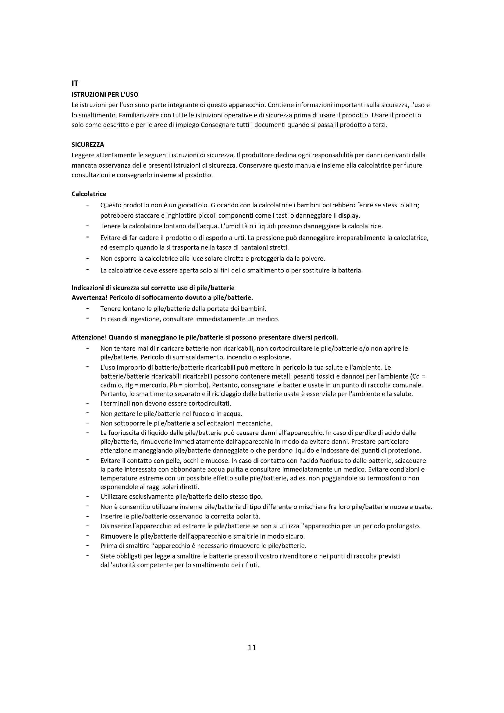 Le istruzioni per l'uso sono parte integrante di questo apparecchio. Contiene informazioni importanti sulla sicurezza, l'uso e lo smaltimento. Familiarizzare con tutte le istruzioni operative e di sicurezza prima di usare il prodotto. Usare il prodotto solo come descritto e per le aree di impiego Consegnare tutti i documenti quando si passa il prodotto a terzi. SICUREZZA Leggere attentamente le seguenti istruzioni di sicurezza. Il produttore declina ogni responsabilità per danni derivanti dalla mancata osservanza delle presenti istruzioni di sicurezza. Conservare questo manuale insieme alla calcolatrice per future consultazioni e consegnarlo insieme al prodotto. Calcolatrice