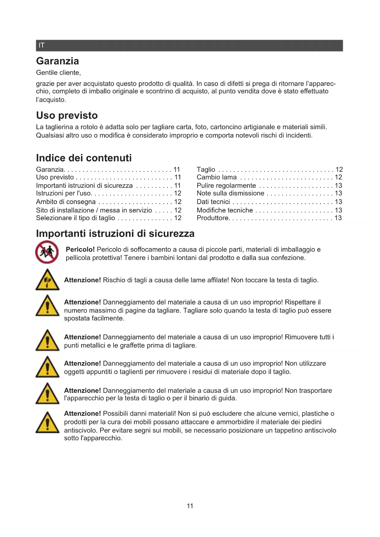 - Garanzia Gentile cliente, grazie per aver acquistato questo prodotto di qualità. In caso di difetti si prega di ritornare l’apparec- chio, completo di imballo originale e scontrino di acquisto, al punto vendita dove è stato eettuato l’acquisto. Uso previsto La taglierina a rotolo è adatta solo per tagliare carta, foto, cartoncino artigianale e materiali simili. Qualsiasi altro uso o modica è considerato improprio e comporta notevoli rischi di incidenti. Indice dei contenuti Garanzia p. 11