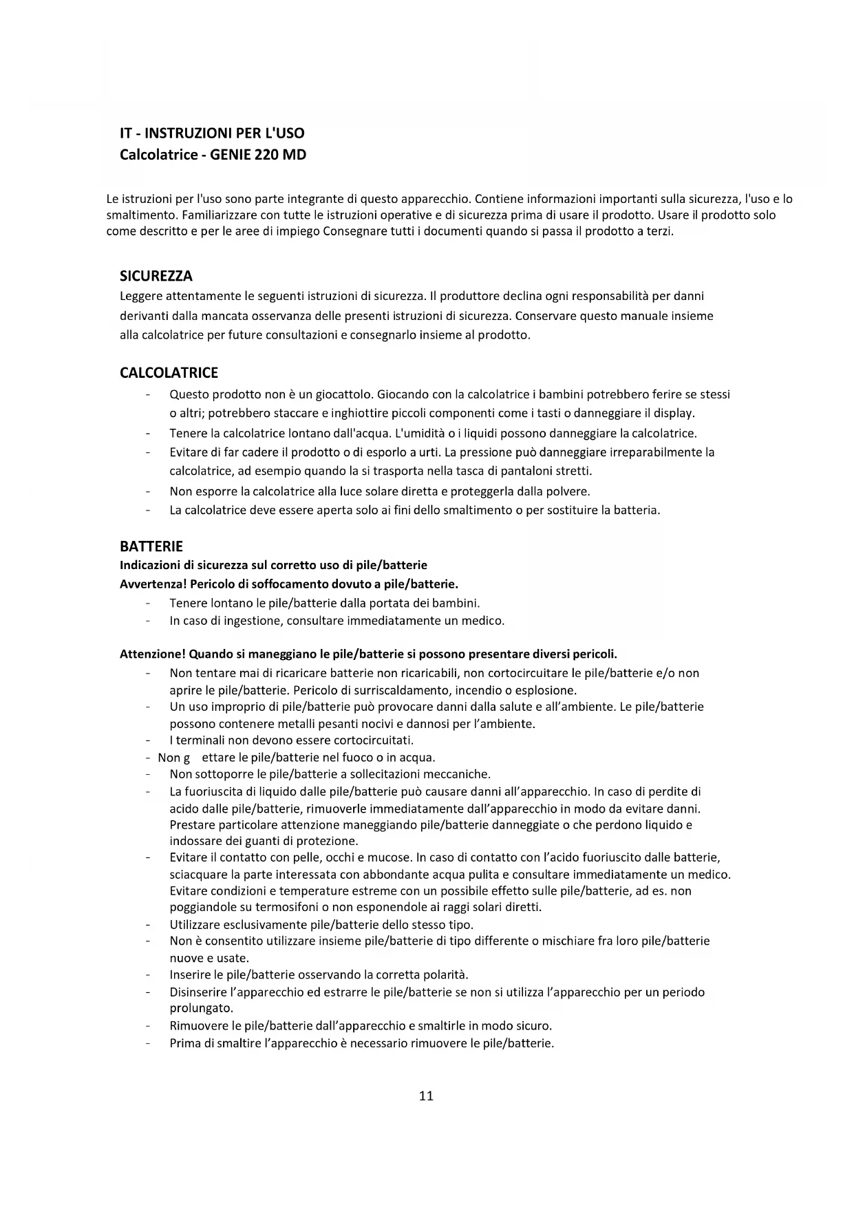 Calcolatrice - GENIE 220 MD Le istruzioni per l'uso sono parte integrante di questo apparecchio. Contiene informazioni importanti sulla sicurezza, l'uso e lo smaltimento. Familiarizzare con tutte le istruzioni operative e di sicurezza prima di usare il prodotto. Usare il prodotto solo come descritto e per le aree di impiego Consegnare tutti i documenti quando si passa il prodotto a terzi. SICUREZZA Leggere attentamente le seguenti istruzioni di sicurezza. Il produttore declina ogni responsabilità per danni derivanti dalla mancata osservanza delle presenti istruzioni di sicurezza. Conservare questo manuale insieme alla calcolatrice per future consultazioni e consegnarlo insieme al prodotto. CALCOLATRICE - Questo prodotto non è un giocattolo. Giocando con la calcolatrice i bambini potrebbero ferire se stessi o altri; potrebbero staccare e inghiottire piccoli componenti come i tasti o danneggiare il display. - Tenere la calcolatrice lontano dall'acqua. L'umidità o i liquidi possono danneggiare la calcolatrice. - Evitare di far cadere il prodotto o di esporlo a urti. La pressione può danneggiare irreparabilmente la calcolatrice, ad esempio quando la si trasporta nella tasca di pantaloni stretti. - Non esporre la calcolatrice alla luce solare diretta e proteggerla dalla polvere. - La calcolatrice deve essere aperta solo ai fini dello smaltimento o per sostituire la batteria. BATTERIE Indicazioni di sicurezza sul corretto uso di pile/batterie Avvertenza! Pericolo di soffocamento dovuto a pile/batterie. - Tenere lontano le pile/batterie dalla portata dei bambini. - In caso di ingestione, consultare immediatamente un medico. Attenzione! Quando si maneggiano le pile/batterie si possono presentare diversi pericoli. - Non tentare mai di ricaricare batterie non ricaricabili, non cortocircuitare le pile/batterie e/o non aprire le pile/batterie. Pericolo di surriscaldamento, incendio o esplosione. - Un uso improprio di pile/batterie può provocare danni dalla salute e all’ambiente. Le pile/batterie possono contenere metalli pesanti nocivi e dannosi per l’ambiente. - I terminali non devono essere cortocircuitati. - Non g ettare le pile/batterie nel fuoco o in acqua. - Non sottoporre le pile/batterie a sollecitazioni meccaniche. - La fuoriuscita di liquido dalle pile/batterie può causare danni all’apparecchio. In caso di perdite di acido dalle pile/batterie, rimuoverle immediatamente dall’apparecchio in modo da evitare danni. Prestare particolare attenzione maneggiando pile/batterie danneggiate o che perdono liquido e indossare dei guanti di protezione. - Evitare il contatto con pelle, occhi e mucose. In caso di contatto con l’acido fuoriuscito dalle batterie, sciacquare la parte interessata con abbondante acqua pulita e consultare immediatamente un medico. Evitare condizioni e temperature estreme con un possibile effetto sulle pile/batterie, ad es. non poggiandole su termosifoni o non esponendole ai raggi solari diretti. - Utilizzare esclusivamente pile/batterie dello stesso tipo. - Non è consentito utilizzare insieme pile/batterie di tipo differente o mischiare fra loro pile/batterie nuove e usate. - Inserire le pile/batterie osservando la corretta polarità. - Disinserire l’apparecchio ed estrarre le pile/batterie se non si utilizza l’apparecchio per un periodo prolungato. - Rimuovere le pile/batterie dall’apparecchio e smaltirle in modo sicuro. - Prima di smaltire l’apparecchio è necessario rimuovere le pile/batterie.12