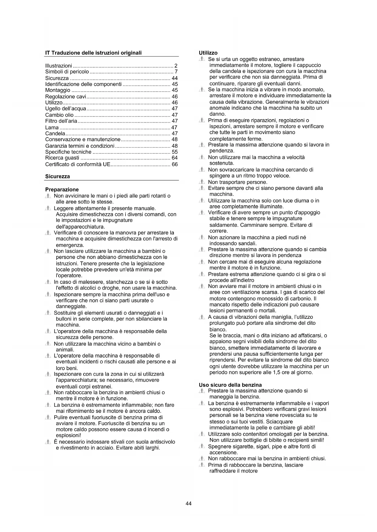 - Certificato di conformità UE Sicurezza Preparazione Non avvicinare le mani o i piedi alle parti rotanti o alle aree sotto le stesse. Leggere attentamente il presente manuale. Acquisire dimestichezza con i diversi comandi, con le impostazioni e le impugnature dell'apparecchiatura. Verificare di conoscere la manovra per arrestare la macchina e acquisire dimestichezza con l'arresto di emergenza. Non lasciare utilizzare la macchina a bambini o persone che non abbiano dimestichezza con le istruzioni. Tenere presente che la legislazione locale potrebbe prevedere un'età minima per l'operatore. In caso di malessere, stanchezza o se si è sotto l'effetto di alcolici o droghe, non usare la macchina. Ispezionare sempre la macchina prima dell'uso e verificare che non ci siano parti usurate o danneggiate. Sostituire gli elementi usurati o danneggiati e i bulloni in serie complete, per non sbilanciare la macchina. L'operatore della macchina è responsabile della sicurezza delle persone. Non utilizzare la macchina vicino a bambini o animali. L'operatore della macchina è responsabile di eventuali incidenti o rischi causati alle persone e ai loro beni. Ispezionare con cura la zona in cui si utilizzerà l'apparecchiatura; se necessario, rimuovere eventuali corpi estranei. Non rabboccare la benzina in ambienti chiusi o mentre il motore è in funzione. La benzina è estremamente infiammabile; non fare mai rifornimento se il motore è ancora caldo. Pulire eventuali fuoriuscite di benzina prima di avviare il motore. Fuoriuscite di benzina su un motore caldo possono essere causa d incendi o esplosioni! È necessario indossare stivali con suola antiscivolo e rivestimento in acciaio. Evitare abiti larghi. p. 66