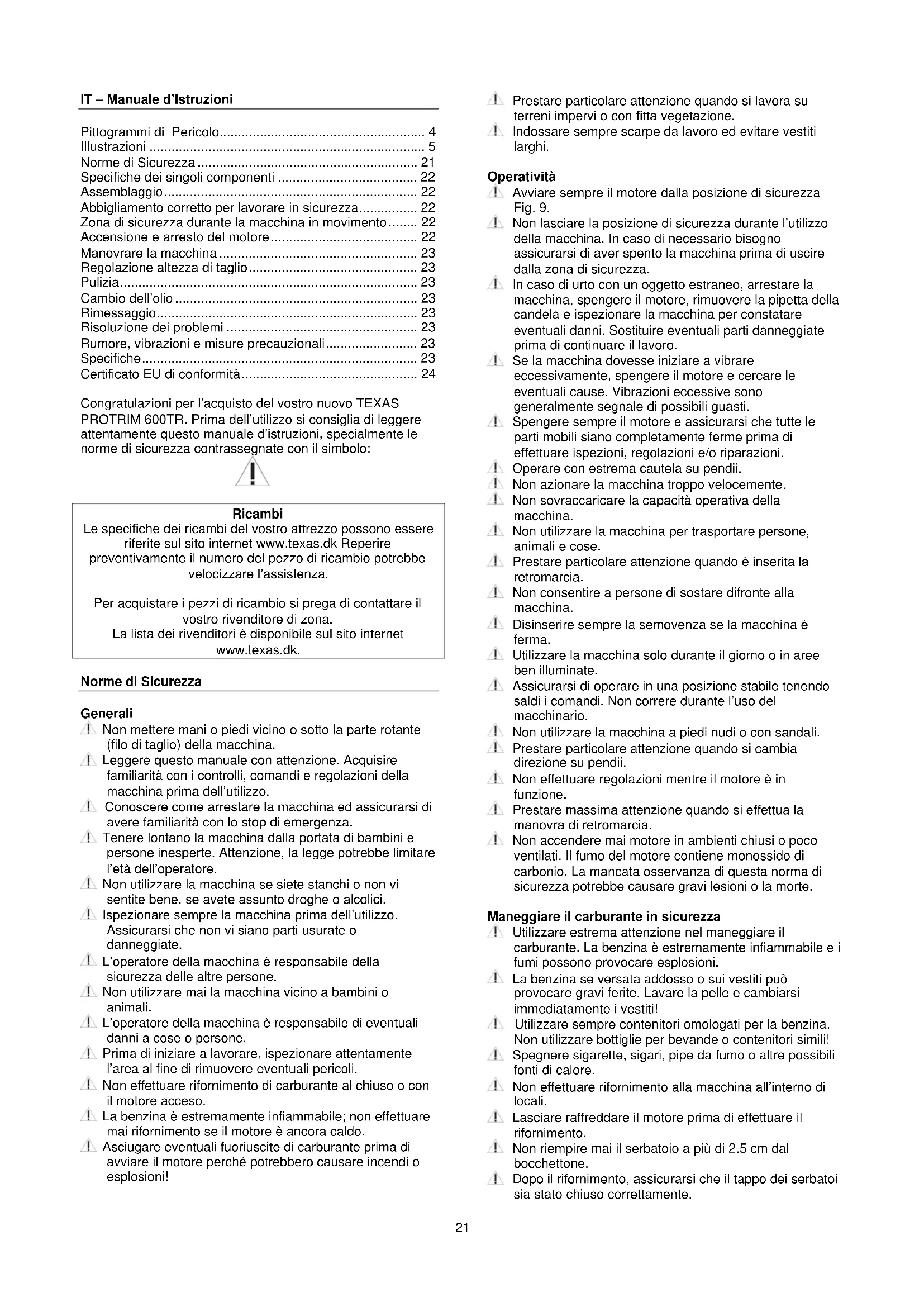 Ricambi Le specifiche dei ricambi del vostro attrezzo possono essere riferite sul sito internet www.texas.dk Reperire preventivamente il numero del pezzo di ricambio potrebbe velocizzare l’assistenza. Per acquistare i pezzi di ricambio si prega di contattare il vostro rivenditore di zona. La lista dei rivenditori è disponibile sul sito internet www.texas.dk. Norme di Sicurezza Generali Non mettere mani o piedi vicino o sotto la parte rotante (filo di taglio) della macchina. Leggere questo manuale con attenzione. Acquisire familiarità con i controlli, comandi e regolazioni della macchina prima dell’utilizzo. Conoscere come arrestare la macchina ed assicurarsi di avere familiarità con lo stop di emergenza. Tenere lontano la macchina dalla portata di bambini e persone inesperte. Attenzione, la legge potrebbe limitare l’età dell’operatore. Non utilizzare la macchina se siete stanchi o non vi sentite bene, se avete assunto droghe o alcolici. Ispezionare sempre la macchina prima dell’utilizzo. Assicurarsi che non vi siano parti usurate o danneggiate. L’operatore della macchina è responsabile della sicurezza delle altre persone. Non utilizzare mai la macchina vicino a bambini o animali. L’operatore della macchina è responsabile di eventuali danni a cose o persone. Prima di iniziare a lavorare, ispezionare attentamente l’area al fine di rimuovere eventuali pericoli. Non effettuare rifornimento di carburante al chiuso o con il motore acceso. La benzina è estremamente infiammabile; non effettuare mai rifornimento se il motore è ancora caldo. Asciugare eventuali fuoriuscite di carburante prima di avviare il motore perché potrebbero causare incendi o esplosioni! Prestare particolare attenzione quando si lavora su terreni impervi o con fitta vegetazione. Indossare sempre scarpe da lavoro ed evitare vestiti larghi. Operatività Avviare sempre il motore dalla posizione di sicurezza Fig. 9. Non lasciare la posizione di sicurezza durante l’utilizzo della macchina. In caso di necessario bisogno assicurarsi di aver spento la macchina prima di uscire dalla zona di sicurezza. In caso di urto con un oggetto estraneo, arrestare la macchina, spengere il motore, rimuovere la pipetta della candela e ispezionare la macchina per constatare eventuali danni. Sostituire eventuali parti danneggiate prima di continuare il lavoro. Se la macchina dovesse iniziare a vibrare eccessivamente, spengere il motore e cercare le eventuali cause. Vibrazioni eccessive sono generalmente segnale di possibili guasti. Spengere sempre il motore e assicurarsi che tutte le parti mobili siano completamente ferme prima di effettuare ispezioni, regolazioni e/o riparazioni. Operare con estrema cautela su pendii. Non azionare la macchina troppo velocemente. Non sovraccaricare la capacità operativa della macchina. Non utilizzare la macchina per trasportare persone, animali e cose. Prestare particolare attenzione quando è inserita la retromarcia. Non consentire a persone di sostare difronte alla macchina. Disinserire sempre la semovenza se la macchina è ferma. Utilizzare la macchina solo durante il giorno o in aree ben illuminate. Assicurarsi di operare in una posizione stabile tenendo saldi i comandi. Non correre durante l’uso del macchinario. Non utilizzare la macchina a piedi nudi o con sandali. Prestare particolare attenzione quando si cambia direzione su pendii. Non effettuare regolazioni mentre il motore è in funzione. Prestare massima attenzione quando si effettua la manovra di retromarcia. Non accendere mai motore in ambienti chiusi o poco ventilati. Il fumo del motore contiene monossido di carbonio. La mancata osservanza di questa norma di sicurezza potrebbe causare gravi lesioni o la morte. Maneggiare il carburante in sicurezza Utilizzare estrema attenzione nel maneggiare il carburante. La benzina è estremamente infiammabile e i fumi possono provocare esplosioni. La benzina se versata addosso o sui vestiti può provocare gravi ferite. Lavare la pelle e cambiarsi immediatamente i vestiti! Utilizzare sempre contenitori omologati per la benzina. Non utilizzare bottiglie per bevande o contenitori simili! Spegnere sigarette, sigari, pipe da fumo o altre possibili fonti di calore. Non effettuare rifornimento alla macchina all’interno di locali. Lasciare raffreddare il motore prima di effettuare il rifornimento. Non riempire mai il serbatoio a più di 2.5 cm dal bocchettone. Dopo il rifornimento, assicurarsi che il tappo dei serbatoi sia stato chiuso correttamente.22