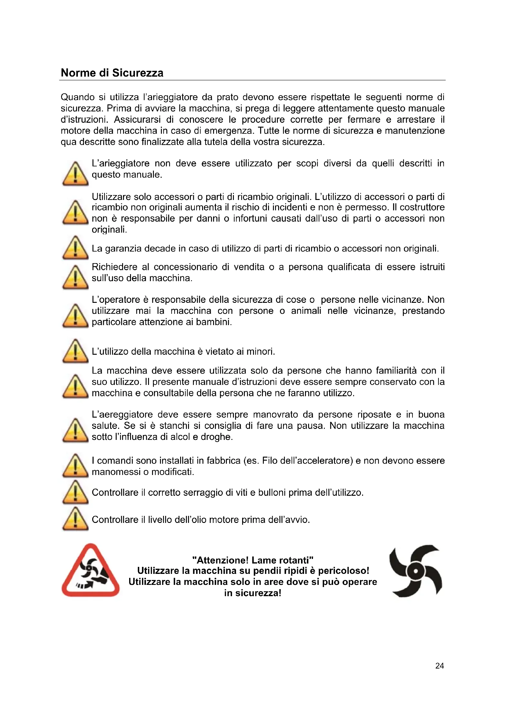 inali. La garanzia decade in caso di utilizzo di parti di ricambio o accessori non originali. Richiedere al concessionario di vendita o a persona qualificata di essere istruiti sull’uso della macchina. L’operatore è responsabile della sicurezza di cose o persone nelle vicinanze. Non utilizzare mai la macchina con persone o animali nelle vicinanze, prestando particolare attenzione ai bambini. L’utilizzo della macchina è vietato ai minori. La macchina deve essere utilizzata solo da persone che hanno familiarità con il suo utilizzo. Il presente manuale d’istruzioni deve essere sempre conservato con la macchina e consultabile della persona che ne faranno utilizzo. L’aereggiatore deve essere sempre manovrato da persone riposate e in buona salute. Se si è stanchi si consiglia di fare una pausa. Non utilizzare la macchina sotto l’influenza di alcol e droghe. I comandi sono installati in fabbrica (es. Filo dell’acceleratore) e non devono essere manomessi o modificati. Controllare il corretto serraggio di viti e bulloni prima dell’utilizzo. Controllare il livello dell’olio motore prima dell’avvio.