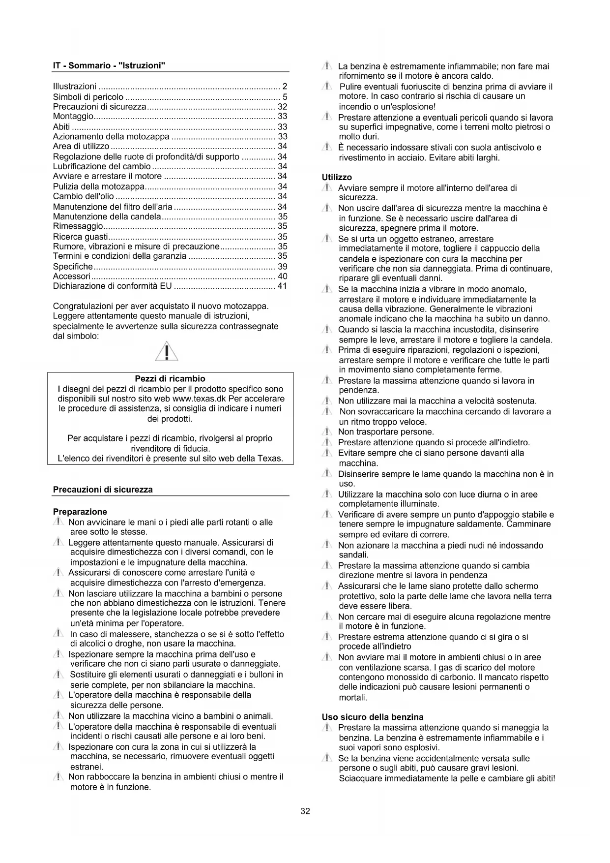 - Altre condizioni nelle quali Texas non può essere ritenuta responsabile. Il centro di assistenza può determinare se un caso sia da considerare un diritto di garanzia o meno. La tua ricevuta è la tua nota di garanzia, ecco perché dovrebbe essere conservata. RICORDA: l’acquisto di pezzi di ricambio così come qualsiasi richiesta di riparazione in garanzia, art. numero (es. 900611XX), anno e numero di serie dovrebbero sempre essere registrati. Sono presenti sull'etichetta CE sulla macchina! *Ci riserviamo il diritto di cambiare le condizioni e non ci assumiamo alcuna responsabilità per eventuali errori di stampa36
