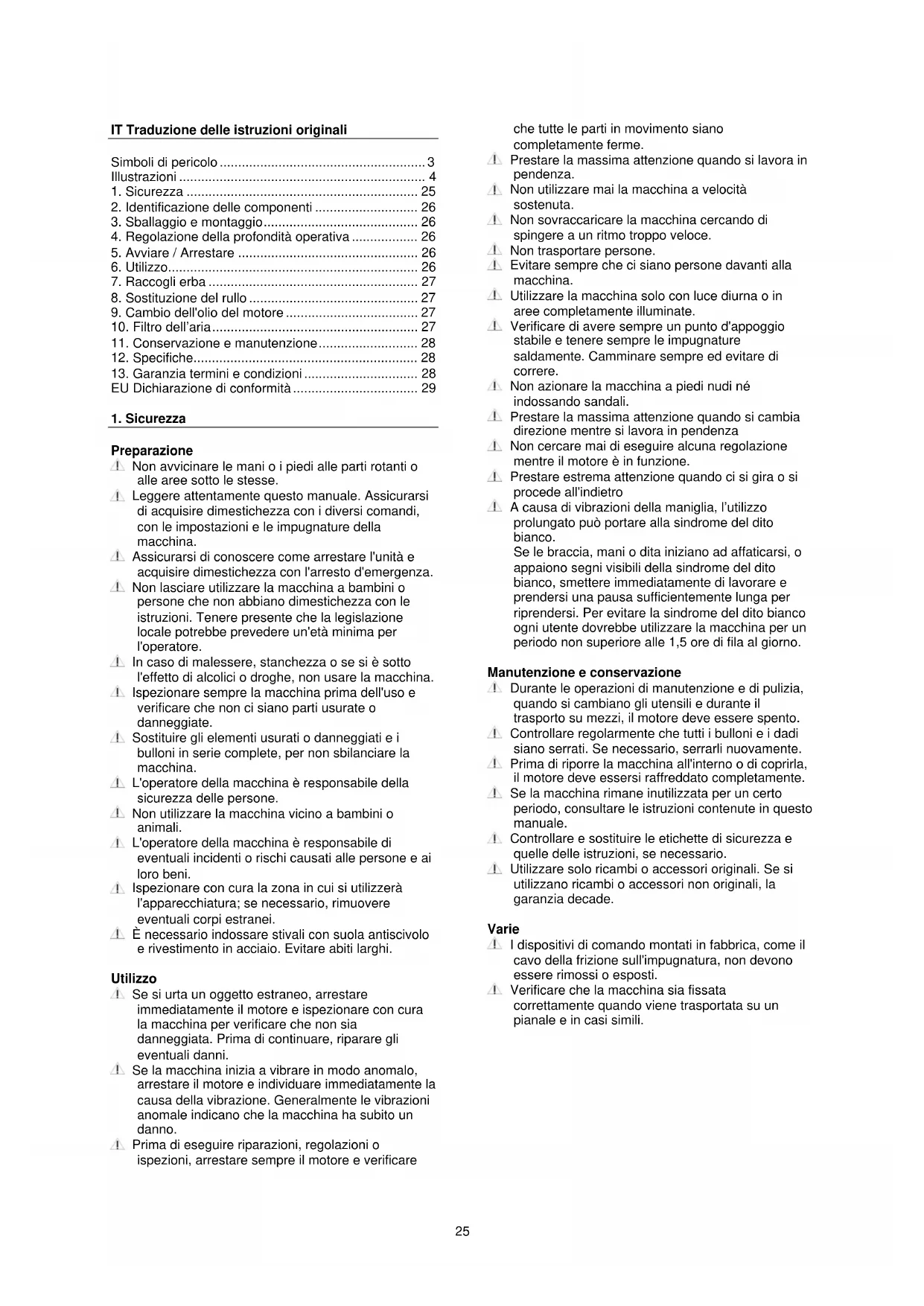 Preparazione Non avvicinare le mani o i piedi alle parti rotanti o alle aree sotto le stesse. Leggere attentamente questo manuale. Assicurarsi di acquisire dimestichezza con i diversi comandi, con le impostazioni e le impugnature della macchina. Assicurarsi di conoscere come arrestare l'unità e acquisire dimestichezza con l'arresto d'emergenza. Non lasciare utilizzare la macchina a bambini o persone che non abbiano dimestichezza con le istruzioni. Tenere presente che la legislazione locale potrebbe prevedere un'età minima per l'operatore. In caso di malessere, stanchezza o se si è sotto l'effetto di alcolici o droghe, non usare la macchina. Ispezionare sempre la macchina prima dell'uso e verificare che non ci siano parti usurate o danneggiate. Sostituire gli elementi usurati o danneggiati e i bulloni in serie complete, per non sbilanciare la macchina. L'operatore della macchina è responsabile della sicurezza delle persone. Non utilizzare la macchina vicino a bambini o animali. L'operatore della macchina è responsabile di eventuali incidenti o rischi causati alle persone e ai loro beni. Ispezionare con cura la zona in cui si utilizzerà l'apparecchiatura; se necessario, rimuovere eventuali corpi estranei. È necessario indossare stivali con suola antiscivolo e rivestimento in acciaio. Evitare abiti larghi. Utilizzo Se si urta un oggetto estraneo, arrestare immediatamente il motore e ispezionare con cura la macchina per verificare che non sia danneggiata. Prima di continuare, riparare gli eventuali danni. Se la macchina inizia a vibrare in modo anomalo, arrestare il motore e individuare immediatamente la causa della vibrazione. Generalmente le vibrazioni anomale indicano che la macchina ha subito un danno. Prima di eseguire riparazioni, regolazioni o ispezioni, arrestare sempre il motore e verificare che tutte le parti in movimento siano completamente ferme. Prestare la massima attenzione quando si lavora in pendenza. Non utilizzare mai la macchina a velocità sostenuta. Non sovraccaricare la macchina cercando di spingere a un ritmo troppo veloce. Non trasportare persone. Evitare sempre che ci siano persone davanti alla macchina. Utilizzare la macchina solo con luce diurna o in aree completamente illuminate. Verificare di avere sempre un punto d'appoggio stabile e tenere sempre le impugnature saldamente. Camminare sempre ed evitare di correre. Non azionare la macchina a piedi nudi né indossando sandali. Prestare la massima attenzione quando si cambia direzione mentre si lavora in pendenza Non cercare mai di eseguire alcuna regolazione mentre il motore è in funzione. Prestare estrema attenzione quando ci si gira o si procede all'indietro A causa di vibrazioni della maniglia, l’utilizzo prolungato può portare alla sindrome del dito bianco. Se le braccia, mani o dita iniziano ad affaticarsi, o appaiono segni visibili della sindrome del dito bianco, smettere immediatamente di lavorare e prendersi una pausa sufficientemente lunga per riprendersi. Per evitare la sindrome del dito bianco ogni utente dovrebbe utilizzare la macchina per un periodo non superiore alle 1,5 ore di fila al giorno. Manutenzione e conservazione Durante le operazioni di manutenzione e di pulizia, quando si cambiano gli utensili e durante il trasporto su mezzi, il motore deve essere spento. Controllare regolarmente che tutti i bulloni e i dadi siano serrati. Se necessario, serrarli nuovamente. Prima di riporre la macchina all'interno o di coprirla, il motore deve essersi raffreddato completamente. Se la macchina rimane inutilizzata per un certo periodo, consultare le istruzioni contenute in questo manuale. Controllare e sostituire le etichette di sicurezza e quelle delle istruzioni, se necessario. Utilizzare solo ricambi o accessori originali. Se si utilizzano ricambi o accessori non originali, la garanzia decade. Varie I dispositivi di comando montati in fabbrica, come il cavo della frizione sull'impugnatura, non devono essere rimossi o esposti. Verificare che la macchina sia fissata correttamente quando viene trasportata su un pianale e in casi simili.26