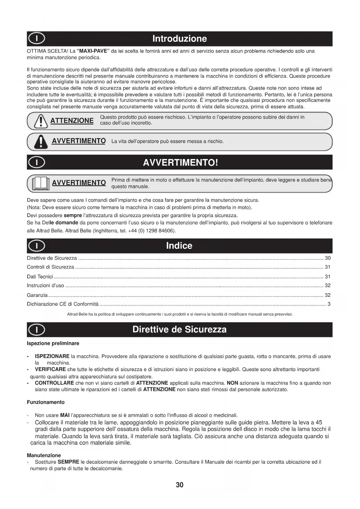 Collocare il materiale tra le lame, appoggiandolo in posizione pianeggiante sulle guide pietra. Mettere la leva a 45 gradi dalla parte supperiore dell’ ossatura della macchina. Regola la posizione dell disco in modo che la lama tocchi il materiale. Quando la leva sarà tirata, il materiale sarà tagliata. Ciò assicura anche una distanza adeguata quando si carica la macchina con materiale simile. Manutenzione - Sostituire SEMPRE le decalcomanie danneggiate o smarrite. Consultare il Manuale dei ricambi per la corretta ubicazione ed il numero di parte di tutte le decalcomanie. La vita dell’operatore può essere messa a rischio. AVVERTIMENTO AVVERTIMENTO! Deve sapere come usare I comandi dell’impianto e che cosa fare per garantire la manutenzione sicura. (Nota: Deve essere sicuro come fermare la macchina in caso di problemi prima di metterla in moto). Devi possedere sempre l’attrezzatura di sicurezza prevista per garantire la propria sicurezza. Se ha Delle domande da porre concernanti l’uso sicuro o la manutenzione dell’impianto, può rivolgersi al tuo supervisore o telefonare alle Altrad Belle. Altrad Belle (Inghilterra, tel. +44 (0) 1298 84606). Prima di mettere in moto o effettuare la manutenzione dell’impianto, deve leggere e studiare bene questo manuale. AVVERTIMENTO Indice Questo prodotto può essere rischioso. L’impianto o l’operatore possono subire dei danni in caso dell’uso incoretto. ATTENZIONE31 Controli di Sicurezza Dati Tecnici Ogni giorno, prima di iniziare il lavoro, oltre alla manutenzione giornaliera ordinaria di 10 minuti, controllare quanto segue per assicurare un funzionamento senza problemi.