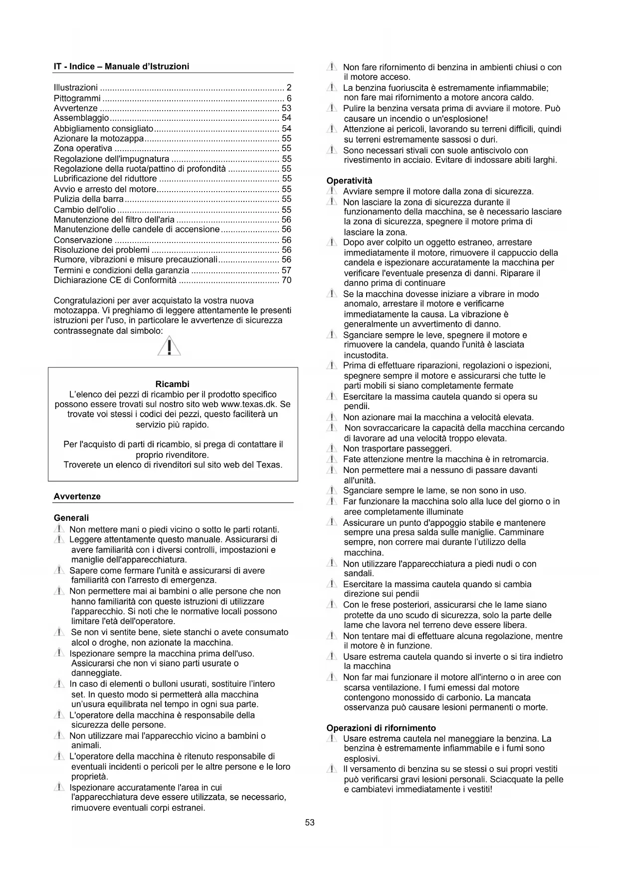 Avvertenze Generali Non mettere mani o piedi vicino o sotto le parti rotanti. Leggere attentamente questo manuale. Assicurarsi di avere familiarità con i diversi controlli, impostazioni e maniglie dell'apparecchiatura. Sapere come fermare l'unità e assicurarsi di avere familiarità con l'arresto di emergenza. Non permettere mai ai bambini o alle persone che non hanno familiarità con queste istruzioni di utilizzare l'apparecchio. Si noti che le normative locali possono limitare l'età dell'operatore. Se non vi sentite bene, siete stanchi o avete consumato alcol o droghe, non azionate la macchina. Ispezionare sempre la macchina prima dell'uso. Assicurarsi che non vi siano parti usurate o danneggiate. In caso di elementi o bulloni usurati, sostituire l’intero set. In questo modo si permetterà alla macchina un’usura equilibrata nel tempo in ogni sua parte. L'operatore della macchina è responsabile della sicurezza delle persone. Non utilizzare mai l'apparecchio vicino a bambini o animali. L'operatore della macchina è ritenuto responsabile di eventuali incidenti o pericoli per le altre persone e le loro proprietà. Ispezionare accuratamente l'area in cui l'apparecchiatura deve essere utilizzata, se necessario, rimuovere eventuali corpi estranei. Non fare rifornimento di benzina in ambienti chiusi o con il motore acceso. La benzina fuoriuscita è estremamente infiammabile; non fare mai rifornimento a motore ancora caldo. Pulire la benzina versata prima di avviare il motore. Può causare un incendio o un'esplosione! Attenzione ai pericoli, lavorando su terreni difficili, quindi su terreni estremamente sassosi o duri. Sono necessari stivali con suole antiscivolo con rivestimento in acciaio. Evitare di indossare abiti larghi. Operatività Avviare sempre il motore dalla zona di sicurezza. Non lasciare la zona di sicurezza durante il funzionamento della macchina, se è necessario lasciare la zona di sicurezza, spegnere il motore prima di lasciare la zona. Dopo aver colpito un oggetto estraneo, arrestare immediatamente il motore, rimuovere il cappuccio della candela e ispezionare accuratamente la macchina per verificare l'eventuale presenza di danni. Riparare il danno prima di continuare Se la macchina dovesse iniziare a vibrare in modo anomalo, arrestare il motore e verificarne immediatamente la causa. La vibrazione è generalmente un avvertimento di danno. Sganciare sempre le leve, spegnere il motore e rimuovere la candela, quando l'unità è lasciata incustodita. Prima di effettuare riparazioni, regolazioni o ispezioni, spegnere sempre il motore e assicurarsi che tutte le parti mobili si siano completamente fermate Esercitare la massima cautela quando si opera su pendii. Non azionare mai la macchina a velocità elevata. Non sovraccaricare la capacità della macchina cercando di lavorare ad una velocità troppo elevata. Non trasportare passeggeri. Fate attenzione mentre la macchina è in retromarcia. Non permettere mai a nessuno di passare davanti all'unità. Sganciare sempre le lame, se non sono in uso. Far funzionare la macchina solo alla luce del giorno o in aree completamente illuminate Assicurare un punto d'appoggio stabile e mantenere sempre una presa salda sulle maniglie. Camminare sempre, non correre mai durante l’utilizzo della macchina. Non utilizzare l'apparecchiatura a piedi nudi o con sandali. Esercitare la massima cautela quando si cambia direzione sui pendii Con le frese posteriori, assicurarsi che le lame siano protette da uno scudo di sicurezza, solo la parte delle lame che lavora nel terreno deve essere libera. Non tentare mai di effettuare alcuna regolazione, mentre il motore è in funzione. Usare estrema cautela quando si inverte o si tira indietro la macchina Non far mai funzionare il motore all'interno o in aree con scarsa ventilazione. I fumi emessi dal motore contengono monossido di carbonio. La mancata osservanza può causare lesioni permanenti o morte. Operazioni di rifornimento Usare estrema cautela nel maneggiare la benzina. La benzina è estremamente infiammabile e i fumi sono esplosivi. Il versamento di benzina su se stessi o sui propri vestiti può verificarsi gravi lesioni personali. Sciacquate la pelle e cambiatevi immediatamente i vestiti!54