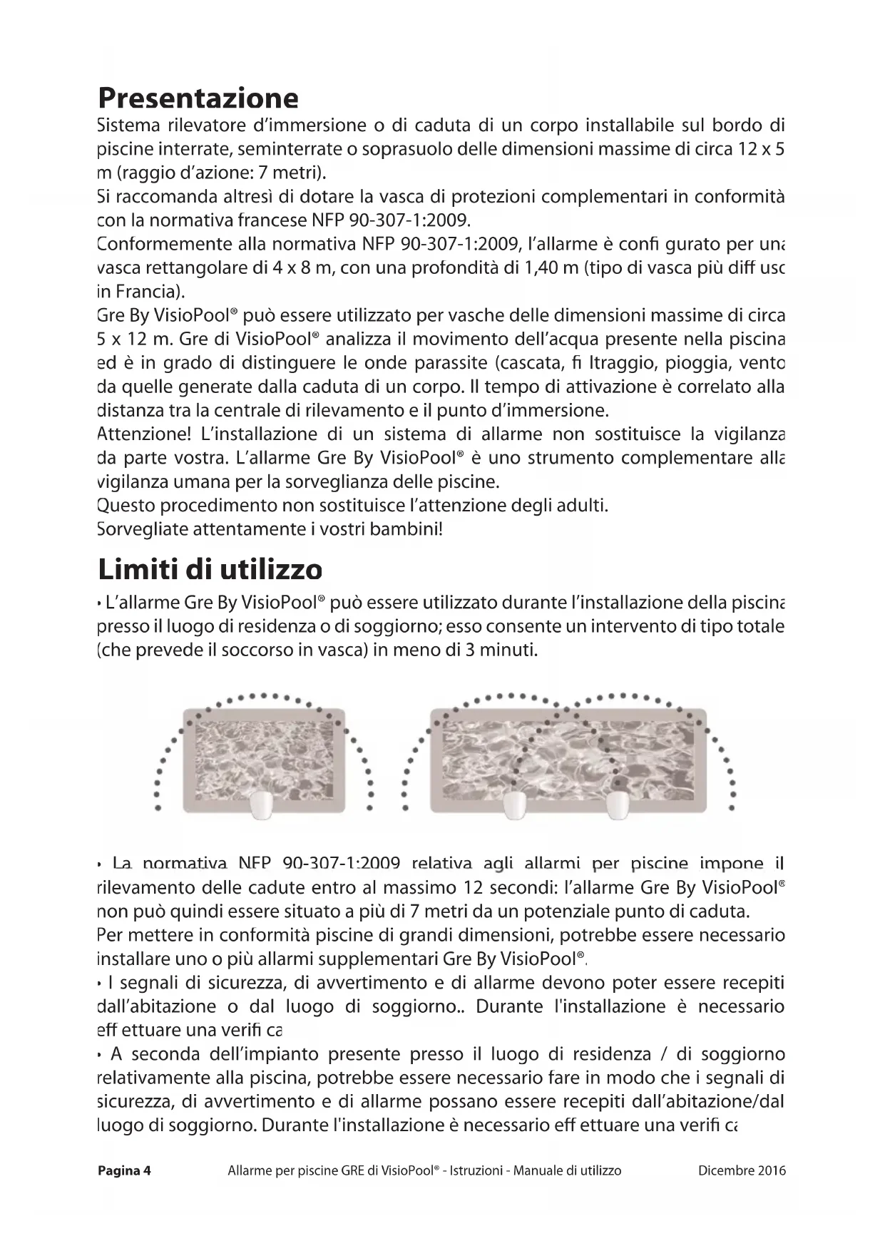 gennaio 2004, tutte le nuove piscine interrate non chiuse e private a uso individuale e collettivo devono essere provviste di un dispositivo di sicurezza a norma. A decorrere da tale data il costruttore o l’installatore di dette piscine è tenuto a fornire al capomastro una nota tecnica indicante il dispositivo. In caso di cessione denitiva o temporanea dell’allarme Gre By VisioPool®, è assolutamente necessario accertarsi che il nuovo utilizzatore sia in possesso di tutti i documenti forniti unitamente all’apparecchiatura in sede di installazione iniziale, ivi compreso l’imballaggio originale, nella propria totalità. I proprietari di piscine interrate non chiuse e private o a uso collettivo installate prima del 1° gennaio 2004 devono essere provviste di un dispositivo di sicurezza a norma dal 1° gennaio 2006. In caso di locazione stagionale dell’abitazione, un dispositivo di sicurezza normalizzato deve essere installato prima del 1° maggio 2004. È fondamentale insistere sulla vigilanza attiva dei genitori. Informazioni inerenti all’allarme Gre By VisioPool® Questo sistema d’allarme Gre di VisioPool® non sostituisce la responsabilità individuale. Esso non intende sostituirsi in alcun modo alla vigilanza dovuta da parte dei genitori/degli adulti responsabili, la quale rappresenta il fattore essenziale per la protezione dei bambini di età inferiore ai cinque anni. Il dispositivo Gre By VisioPool® è un sistema di allarme per piscine interrate non chiuse e private o a uso collettivo. L’allarme è un’apparecchiatura di sicurezza atta a segnalare un pericolo (o un rischio di pericolo). All’emissione del segnale di avvertimento è obbligatorio un intervento rapido di un adulto responsabile entro 3 minuti. Si installa su piscine di dimensioni pari a circa 12 x 5 m massimo (raggio d’azione: 7 metri). Oltre tale distanza si raccomanda di dotare la vasca di protezioni complementari in conformità con quanto indicato dalla normativa francese. L’utilizzatore che interrompa il segnale di avvertimento è cosciente che la vigilanza umana deve intervenire. È assolutamente necessario intervenire al suono del segnale di allarme. È altresì opportuno che tra la ne del bagno e la riattivazione del sistema d’allarme vi sia la più stretta vigilanza dei genitori o degli adulti responsabili. Al ne di ridurre il tempo di latenza è possibile provvedervi agendo sul puntoPagina 14 Allarme per piscine GRE di VisioPool® - Istruzioni - Manuale di utilizzo Dicembre 2016 magnetico con il magnete.