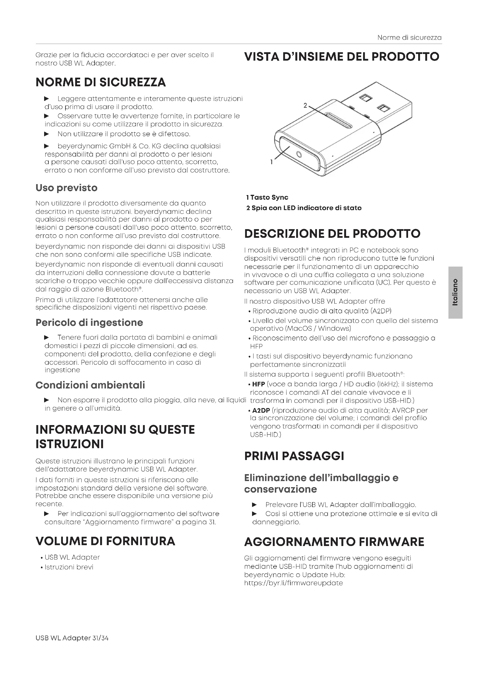 nel manuale d’uso del prodotto beyerdynamic Bluetooth®. Non appena il pairing è completato, la spia a LED dell’USB WL Adapter lampeggia tre volte alternando luce blu e luce bianca. Premendo brevemente il tao Sync (1), l’adattatore USB WL Adapter avvia la ricerca di uno degli apparecchi regirati nell’elenco della funzione Pairing e crea il collegamento con il dispositivo identificato. Cancellare l’elenco degli apparecchi già collegati: ► Premere per 10 secondi il taoSync (1) sull’USB WL Adapter. La spia a LED lampeggia con luce gialla. L’elenco degli apparecchi Bluetooth® già collegati (massimo 3) viene cancellato. Panoramica delle spie a LED Spia a LED Funzione Luce bianca accesa fissa Nessun collegamento, non in modalità Pairing Luce rossa - blu che lampeggia velocemente Modalità Pairing Luce blu - bianca lampeggiante per 3 volte Pairing completato Luce gialla che lampeggia velocemente Elenco Pairing cancellato Luce blu accesa fissa Apparecchio collegato Luce verde accesa fissa Chiamata in corso Luce rossa accesa fissa Modalità Mute Funzioni suppoate dall’USB WL Adapter Se accoppiato al PC o a laptop/dispositivi poatili, il noro USB WL Adapter consente di utilizzare funzioni come la modalità Mute e le funzioni di chiamata (rifiuta), per esempio, che spesso non sono suppoate dai dispositivi di riproduzione. ► In tal caso tenere presente il manuale d’uso del rispettivo prodotto beyerdynamic Bluetooth®.Aiuto in caso di problemi / FAQ USB WL Adapter 33/34