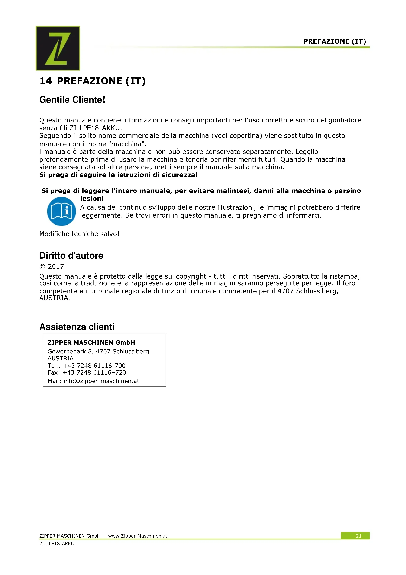 NOT ICE Should you in necessary repairs not able to properly to perform or you have not the prescribed training for it always attract a workshop to fix the problem.PREFAZIONE (IT) ZIPPER MASCHINEN GmbH www.Zipper-Maschinen.at 21 ZI-LPE18-AKKU 14 PREFAZIONE (IT) Gentile Cliente! Questo manuale contiene informazioni e consigli importanti per l'uso corretto e sicuro del gonfiatore senza fili ZI-LPE18-AKKU. Seguendo il solito nome commerciale della macchina (vedi copertina) viene sostituito in questo manuale con il nome "macchina". l manuale è parte della macchina e non può essere conservato separatamente. Leggilo profondamente prima di usare la macchina e tenerla per riferimenti futuri. Quando la macchina viene consegnata ad altre persone, metti sempre il manuale sulla macchina. Si prega di seguire le istruzioni di sicurezza! Si prega di leggere l'intero manuale, per evitare malintesi, danni alla macchina o persino lesioni! A causa del continuo sviluppo delle nostre illustrazioni, le immagini potrebbero differire leggermente. Se trovi errori in questo manuale, ti preghiamo di informarci. Modifiche tecniche salvo! Diritto d'autore © 2017 Questo manuale è protetto dalla legge sul copyright - tutti i diritti riservati. Soprattutto la ristampa, così come la traduzione e la rappresentazione delle immagini saranno perseguite per legge. Il foro competente è il tribunale regionale di Linz o il tribunale competente per il 4707 Schlüsslberg, AUSTRIA.