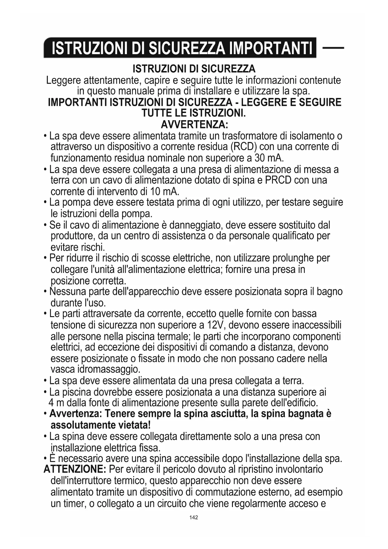 Leggere attentamente, capire e seguire tutte le informazioni contenute in questo manuale prima di installare e utilizzare la spa. IMPORTANTI ISTRUZIONI DI SICUREZZA - LEGGERE E SEGUIRE TUTTE LE ISTRUZIONI. AVVERTENZA: