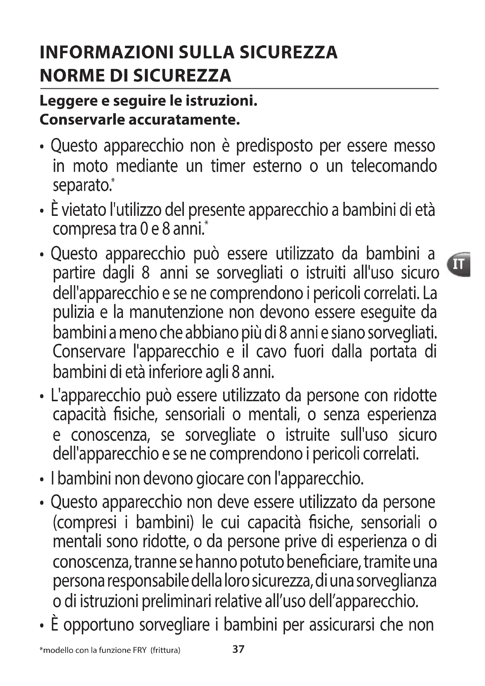- È opportuno sorvegliare i bambini per assicurarsi che non *modello con la funzione FRY (frittura)38 giochino con l’apparecchio.