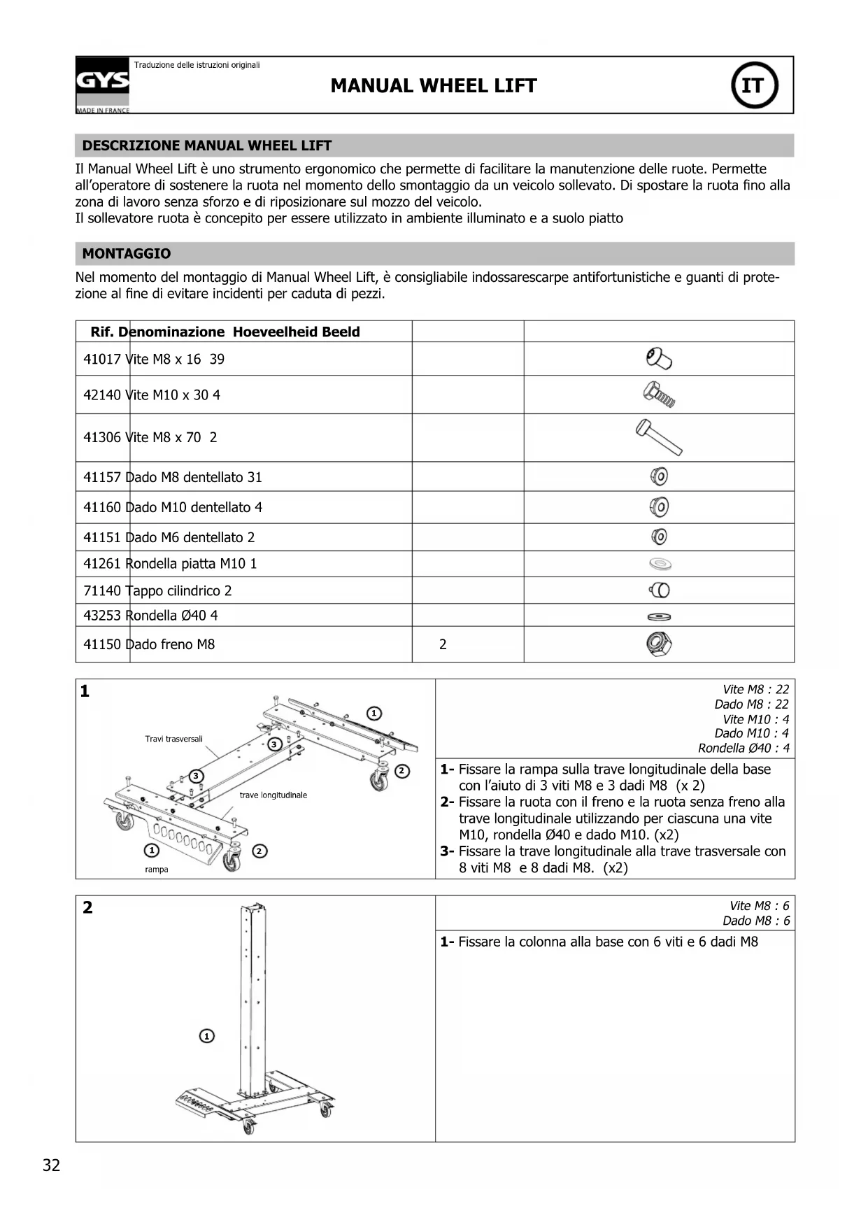 Il Manual Wheel Lift è uno strumento ergonomico che permette di facilitare la manutenzione delle ruote. Permette all’operatore di sostenere la ruota nel momento dello smontaggio da un veicolo sollevato. Di spostare la ruota no alla zona di lavoro senza sforzo e di riposizionare sul mozzo del veicolo. Il sollevatore ruota è concepito per essere utilizzato in ambiente illuminato e a suolo piatto MONTAGGIO Nel momento del montaggio di Manual Wheel Lift, è consigliabile indossarescarpe antifortunistiche e guanti di prote- zione al ne di evitare incidenti per caduta di pezzi. Rif. Denominazione Hoeveelheid Beeld 41017 Vite M8 x 16 39 42140 Vite M10 x 30 4 41306 Vite M8 x 70 2 41157 Dado M8 dentellato 31 41160 Dado M10 dentellato 4 41151 Dado M6 dentellato 2 41261 Rondella piatta M10 1 71140 Tappo cilindrico 2 43253 Rondella Ø40 4 41150 Dado freno M8 2 rampatrave longitudinaleTravi trasversali