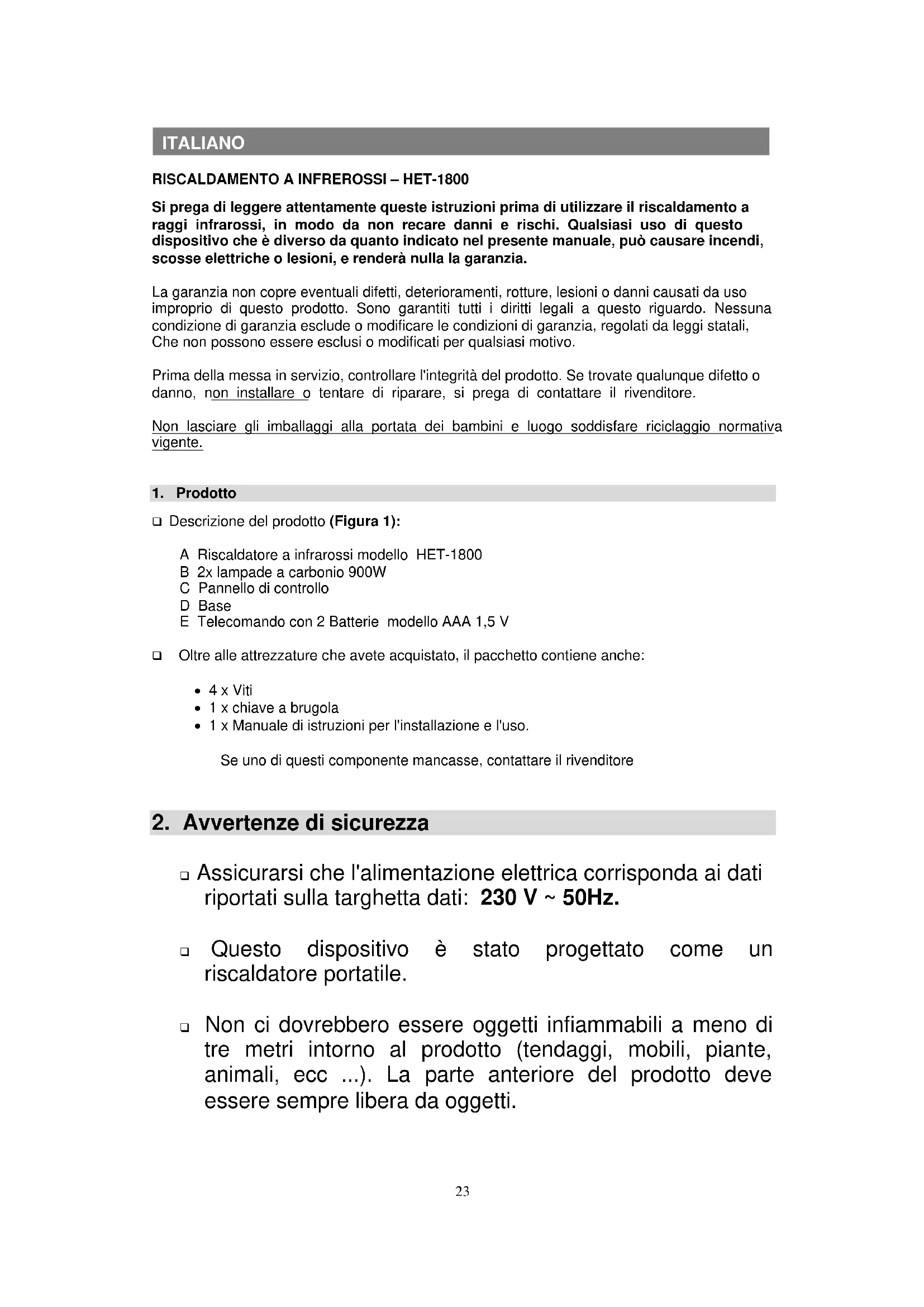 Descrizione del prodotto (Figura 1): A Riscaldatore a infrarossi modello HET-1800 B 2x lampade a carbonio 900W C Pannello di controllo D Base E Telecomando con 2 Batterie modello AAA 1,5 V Oltre alle attrezzature che avete acquistato, il pacchetto contiene anche: 4 x Viti 1 x chiave a brugola 1 x Manuale di istruzioni per l'installazione e l'uso. Se uno di questi componente mancasse, contattare il rivenditore