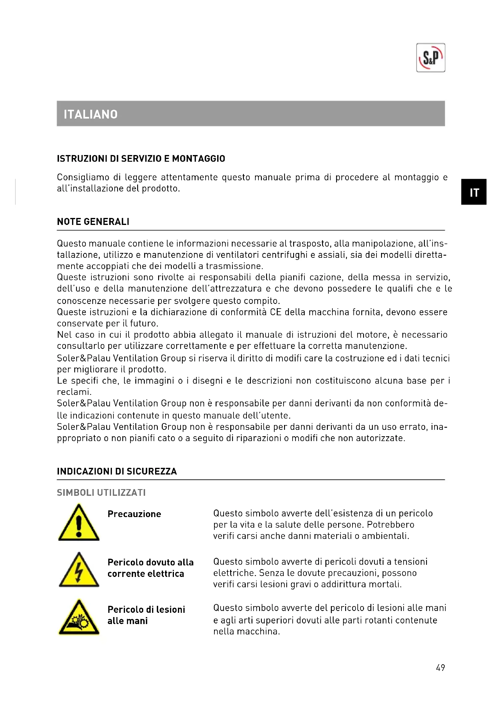 Consigliamo di leggere attentamente questo manuale prima di procedere al montaggio e all’installazione del prodotto. NOTE GENERALI Questo manuale contiene le informazioni necessarie al trasposto, alla manipolazione, all’ins- tallazione, utilizzo e manutenzione di ventilatori centrifughi e assiali, sia dei modelli diretta- mente accoppiati che dei modelli a trasmissione. Queste istruzioni sono rivolte ai responsabili della pianifi cazione, della messa in servizio, dell’uso e della manutenzione dell’attrezzatura e che devono possedere le qualifi che e le conoscenze necessarie per svolgere questo compito. Queste istruzioni e la dichiarazione di conformità CE della macchina fornita, devono essere conservate per il futuro. Nel caso in cui il prodotto abbia allegato il manuale di istruzioni del motore, è necessario consultarlo per utilizzare correttamente e per effettuare la corretta manutenzione. Soler&Palau Ventilation Group si riserva il diritto di modifi care la costruzione ed i dati tecnici per migliorare il prodotto. Le specifi che, le immagini o i disegni e le descrizioni non costituiscono alcuna base per i reclami. Soler&Palau Ventilation Group non è responsabile per danni derivanti da non conformità de- lle indicazioni contenute in questo manuale dell’utente. Soler&Palau Ventilation Group non è responsabile per danni derivanti da un uso errato, ina- ppropriato o non pianifi cato o a seguito di riparazioni o modifi che non autorizzate.
