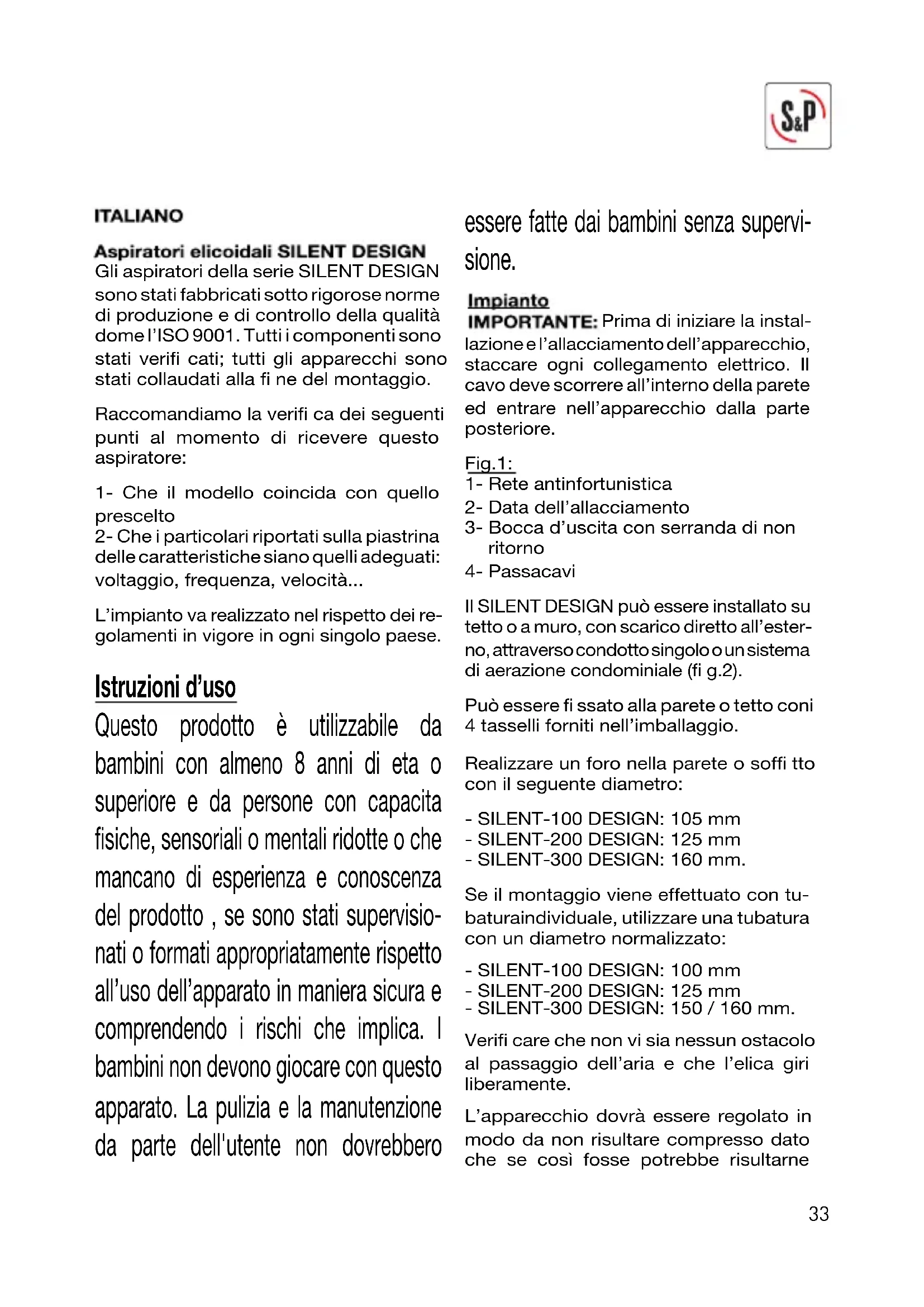 Il SILENT DESIGN può essere installato su tetto o a muro, con scarico diretto all’ester- no, attraverso condotto singolo o un sistema di aerazione condominiale (fi g.2). Può essere fi ssato alla parete o tetto coni 4 tasselli forniti nell’imballaggio. Realizzare un foro nella parete o soffi tto con il seguente diametro: Istruzioni d’uso Questo prodotto è utilizzabile da bambini con almeno 8 anni di eta o superiore e da persone con capacita fisiche, sensoriali o mentali ridotte o che mancano di esperienza e conoscenza del prodotto , se sono stati supervisio- nati o formati appropriatamente rispetto all’uso dell’apparato in maniera sicura e comprendendo i rischi che implica. I bambini non devono giocare con questo apparato. La pulizia e la manutenzione da parte dell'utente non dovrebbero essere fatte dai bambini senza supervi- sione. - SILENT-100 DESIGN: 105 mm - SILENT-200 DESIGN: 125 mm - SILENT-300 DESIGN: 160 mm. Se il montaggio viene effettuato con tu- baturaindividuale, utilizzare una tubatura con un diametro normalizzato: - SILENT-100 DESIGN: 100 mm - SILENT-200 DESIGN: 125 mm - SILENT-300 DESIGN: 150 / 160 mm. Verifi care che non vi sia nessun ostacolo al passaggio dell’aria e che l’elica giri liberamente. L’apparecchio dovrà essere regolato in modo da non risultare compresso dato che se così fosse potrebbe risultarne34 ostacolato il giro dell’elica o darebbe luogo a rumorosità. Controllare che la serranda di non ritorno posizionata sullo scarico della bocca d’uscita (3) si apra senza diffi coltà e prestare attenzione a non danneggiarla durante il montaggio. Introdurre il cavo elettrico nel passacavi (4) e fi ssare l’apparecchio alla parete. Realizzare l’allacciamento elettrico come viene descritto qui di seguito, montare di nuovo la rete antinfortunistica (1). Il SILENT DESIGN è un aspiratore prepara- to per un’alimentazione da rete monofase, con la tensione e la frequenza indicate sulla piastrina delle caratteristiche situata sull’apparecchio. Gli aspiratori vengono fabbricati con doppio isolamento elettrico (classe II) e non richiedono quindi presa a terra. Nell’impianto elettrico ci dovrà essere un interruttore omnipolare con un apertura fra i contatti di almeno 3 mm. Il fi lo elettrico dovrà essere introdotto nel SILENT DE- SIGN attraverso il passacavi (5). Una volta introdotto il fi lo eseguire l’allac- ciamento elettrico alla scheda di collega- mento (2) secondo il modello installato: