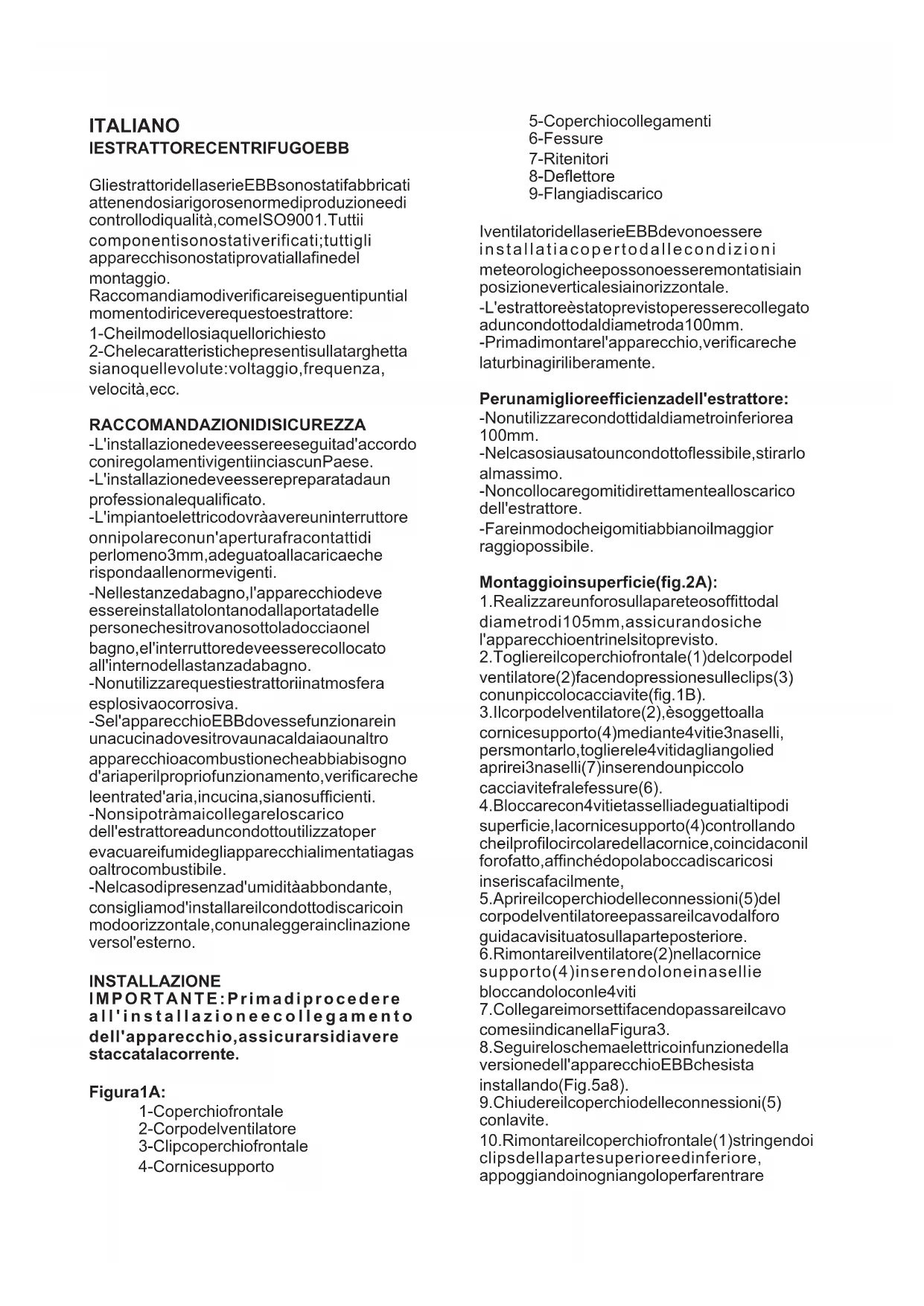 INSTALLAZIONE IMPORTANTE: Prima di procedere all'installazione e collegamento dell'apparecchio, assicurarsi di avere staccata la corrente. Figura 1A: Per una migliore efficienza dell'estrattore: Montaggio in superficie (fig. 2A): Gli estrattori della serie EBB sono stati fabbricati attenendosi a rigorose norme di produzione e di controllo di qualità, come ISO 9001. Tutti i componenti sono stati verificati; tutti gli apparecchi sono stati provati alla fine del montaggio. Raccomandiamo di verificare i seguenti punti al momento di ricevere questo estrattore: