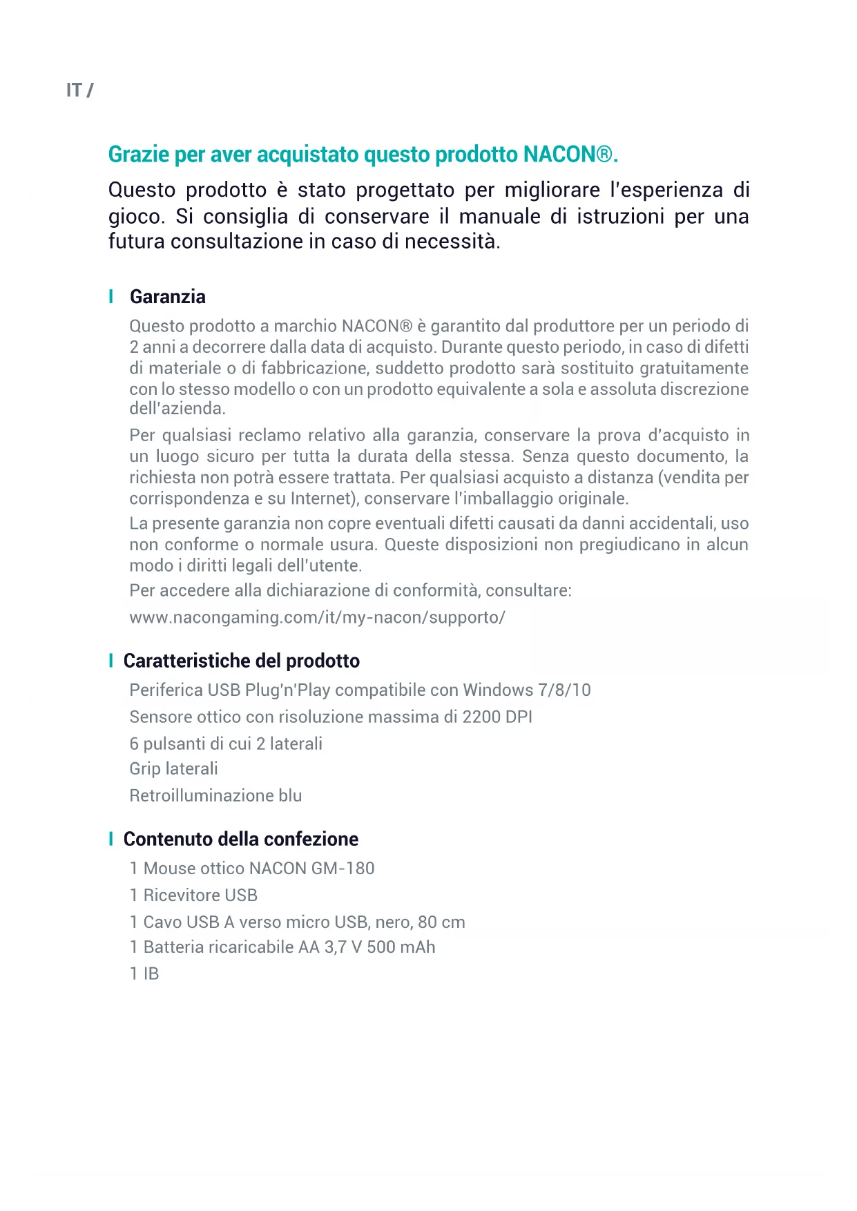 Grazie per aver acquistato questo prodotto NACON®. Questo prodotto è stato progettato per migliorare l’esperienza di gioco. Si consiglia di conservare il manuale di istruzioni per una futura consultazione in caso di necessità. I Garanzia Questo prodotto a marchio NACON® è garantito dal produttore per un periodo di 2 anni a decorrere dalla data di acquisto. Durante questo periodo, in caso di difetti di materiale o di fabbricazione, suddetto prodotto sarà sostituito gratuitamente con lo stesso modello o con un prodotto equivalente a sola e assoluta discrezione dell’azienda. Per qualsiasi reclamo relativo alla garanzia, conservare la prova d’acquisto in un luogo sicuro per tutta la durata della stessa. Senza questo documento, la richiesta non potrà essere trattata. Per qualsiasi acquisto a distanza (vendita per corrispondenza e su Internet), conservare l’imballaggio originale. La presente garanzia non copre eventuali difetti causati da danni accidentali, uso non conforme o normale usura. Queste disposizioni non pregiudicano in alcun modo i diritti legali dell’utente. Per accedere alla dichiarazione di conformità, consultare: www.nacongaming.com/it/my-nacon/supporto/ I Caratteristiche del prodotto Periferica USB Plug'n'Play compatibile con Windows 7/8/10 Sensore ottico con risoluzione massima di 2200 DPI 6 pulsanti di cui 2 laterali Grip laterali Retroilluminazione blu I Contenuto della confezione 1 Mouse ottico NACON GM-180 1 Ricevitore USB 1 Cavo USB A verso micro USB, nero, 80 cm 1 Batteria ricaricabile AA 3,7 V 500 mAh 1 IBIT / I Elementi di controllo