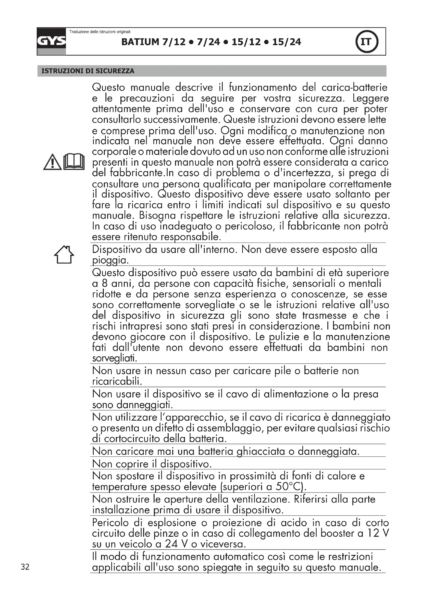Questo manuale descrive il funzionamento del carica-batterie e le precauzioni da seguire per vostra sicurezza. Leggere attentamente prima dell'uso e conservare con cura per poter consultarlo successivamente. Queste istruzioni devono essere lette e comprese prima dell'uso. Ogni modica o manutenzione non indicata nel manuale non deve essere effettuata. Ogni danno corporale o materiale dovuto ad un uso non conforme alle istruzioni presenti in questo manuale non potrà essere considerata a carico del fabbricante.In caso di problema o d'incertezza, si prega di consultare una persona qualicata per manipolare correttamente il dispositivo. Questo dispositivo deve essere usato soltanto per fare la ricarica entro i limiti indicati sul dispositivo e su questo manuale. Bisogna rispettare le istruzioni relative alla sicurezza. In caso di uso inadeguato o pericoloso, il fabbricante non potrà essere ritenuto responsabile. Dispositivo da usare all'interno. Non deve essere esposto alla pioggia. Questo dispositivo può essere usato da bambini di età superiore a 8 anni, da persone con capacità siche, sensoriali o mentali ridotte e da persone senza esperienza o conoscenze, se esse sono correttamente sorvegliate o se le istruzioni relative all'uso del dispositivo in sicurezza gli sono state trasmesse e che i rischi intrapresi sono stati presi in considerazione. I bambini non devono giocare con il dispositivo. Le pulizie e la manutenzione fati dall'utente non devono essere effettuati da bambini non sorvegliati. Non usare in nessun caso per caricare pile o batterie non ricaricabili. Non usare il dispositivo se il cavo di alimentazione o la presa sono danneggiati. Non utilizzare l’apparecchio, se il cavo di ricarica è danneggiato o presenta un difetto di assemblaggio, per evitare qualsiasi rischio di cortocircuito della batteria. Non caricare mai una batteria ghiacciata o danneggiata. Non coprire il dispositivo. Non spostare il dispositivo in prossimità di fonti di calore e temperature spesso elevate (superiori a 50°C). Non ostruire le aperture della ventilazione. Riferirsi alla parte installazione prima di usare il dispositivo. Pericolo di esplosione o proiezione di acido in caso di corto circuito delle pinze o in caso di collegamento del booster a 12 V su un veicolo a 24 V o viceversa. Il modo di funzionamento automatico così come le restrizioni applicabili all'uso sono spiegate in seguito su questo manuale.BATIUM 7/12 • 7/24 • 15/12 • 15/24