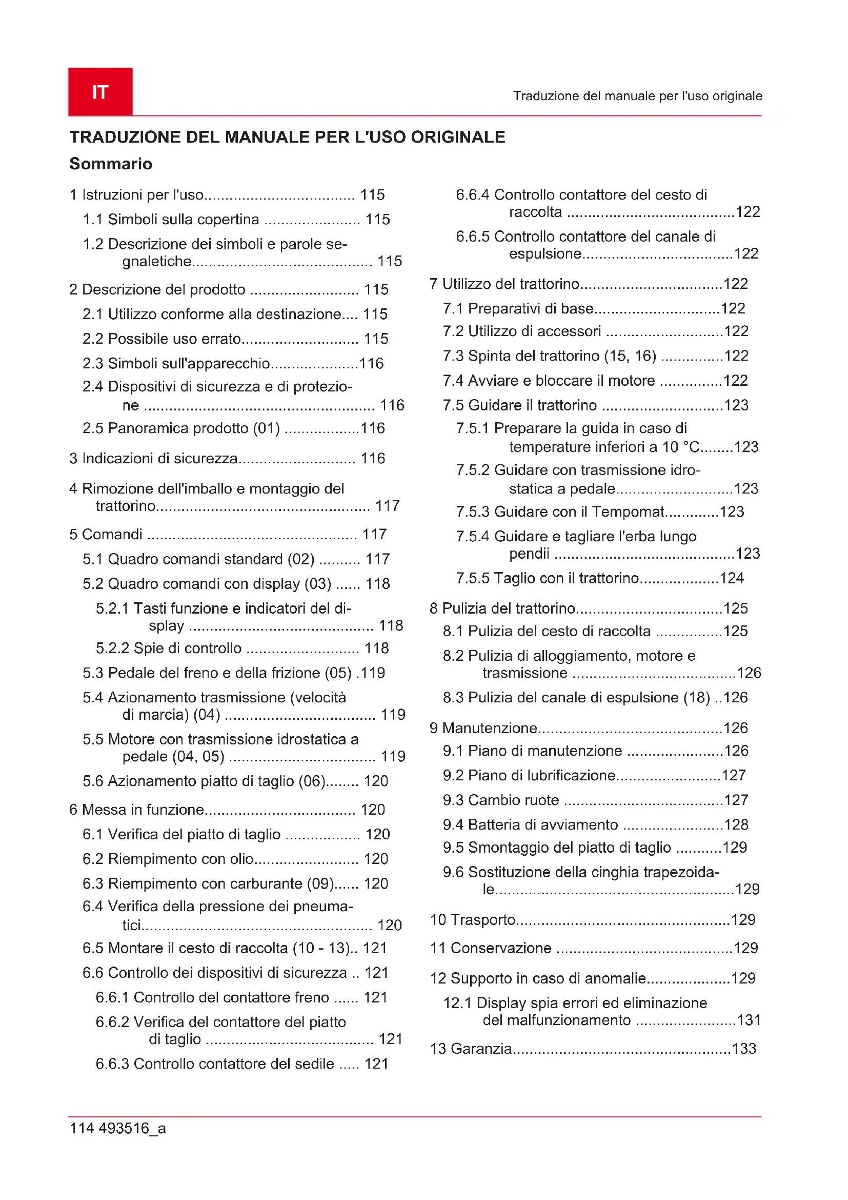 Durante i lavori di manutenzione, cura e puli- zia indossare sempre guanti protettivi! AVVISO In caso di guasti che non sono e- lencati in questa tabella o che non si è in grado di eliminare personalmente, rivolgersi al nostro ser- vizio clienti.IT 130 493516_a Supporto in caso di anomalie Anomalia Causa Eliminazione Il motore non parte. Carenza di carburante. Riempire il serbatoio, verificare lo sfiato serbatoio, verificare il filtro del carburan- te. Carburante sporco di cattiva qualità, carburante vecchio nel serbatoio. Utilizzare sempre carburante nuovo da contenitori puliti; pulire il carburatore (of- ficina del servizio assistenza). Filtro dell'aria sporco. Pulire il filtro dell'aria (vedere istruzioni d'uso del costruttore del motore). Scintilla d'accensione assente. Pulire la candela di accensione, evtl. in- serirne una nuova; controllare cavo di accensione, controllare impianto di ac- censione (officina del servizio assisten- za). Troppo carburante nella camera di combustione a causa di ripetu- ti tentativi di avviamento. Svitare e asciugare la candela di accen- sione. Lo starter non funzio- na. Batteria di avviamento vuota o debole. Caricare la batteria di avviamento. Interruttore di sicurezza del sedi- le di guida non in funzione. Prendere posto correttamente sul sedile di guida, interruttore guasto. Interruttore di sicurezza del pe- dale del freno non in funzione. Premere completamente il pedale del freno. Piatto di taglio inserito. Disattivare piatto di taglio. Fusibile sul cavo (+) della batte- ria di avviamento. Verificare il fusibile ed eventualmente sostituirlo. La potenza motore si affievolisce. Erba troppo alta o troppo umida. Correggere l'altezza di taglio; creare spazio per il piatto di taglio facendo una breve retromarcia. Canale di espulsione/piatto di ta- glio intasati. Fermare il motore e sfilare la chiave di accensione! Pulire canale di espulsione/piatto di ta- glio intasati. Filtro dell'aria sporco. Pulire il filtro dell'aria (vedere istruzioni d'uso del costruttore del motore). La regolazione del carburatore non è corretta. Far controllare l'impostazione (officina del servizio assistenza). Lama fortemente usurata. Sostituire la lama (officina del servizio assistenza). Velocità di marcia troppo eleva- ta. Ridurre la velocità di marcia. Il trattorino vibra in- tensamente. Il piatto di taglio è danneggiato. Controllare il piatto di taglio (officina del servizio assistenza).493516_a 131 Supporto in caso di anomalie Anomalia Causa Eliminazione Il trattorino non parte. In caso di trasmissione idrostati- ca: niente trazione. Commutare la leva di bypass sulla posizio- ne d'esercizio (vedere capitolo 7.3 "Spinta del trattorino (15, 16)", pagina122). Taglio non pulito. Lama usurata, non affilata. Sostituzione o molatura lama. Una volta affilata, equilibrare la lama (officina del servizio assistenza)! Altezza di taglio errata. Correggere l'altezza di taglio. Numero di giri motore troppo basso. Regolare il numero di giri motore massi- mo. Velocità di marcia troppo eleva- ta. Ridurre la velocità di marcia. Pressione pneumatici differente sulle ruote. Pompare alla giusta pressione pneuma- tica. Leggere la corretta pressione sui pneumatici. Il cesto di raccolta non si riempie. Altezza di taglio regolata troppo bassa. Correggere l'altezza di taglio. L'erba è umida - è troppo pesan- te per essere trasportata dalla corrente d'aria. Cambiare orario per il taglio, attendere che il prato si asciughi. Lama fortemente usurata. Sostituire lama. (Servizio officina clienti) Erba troppo alta. Tagliare l'erba in due passaggi: