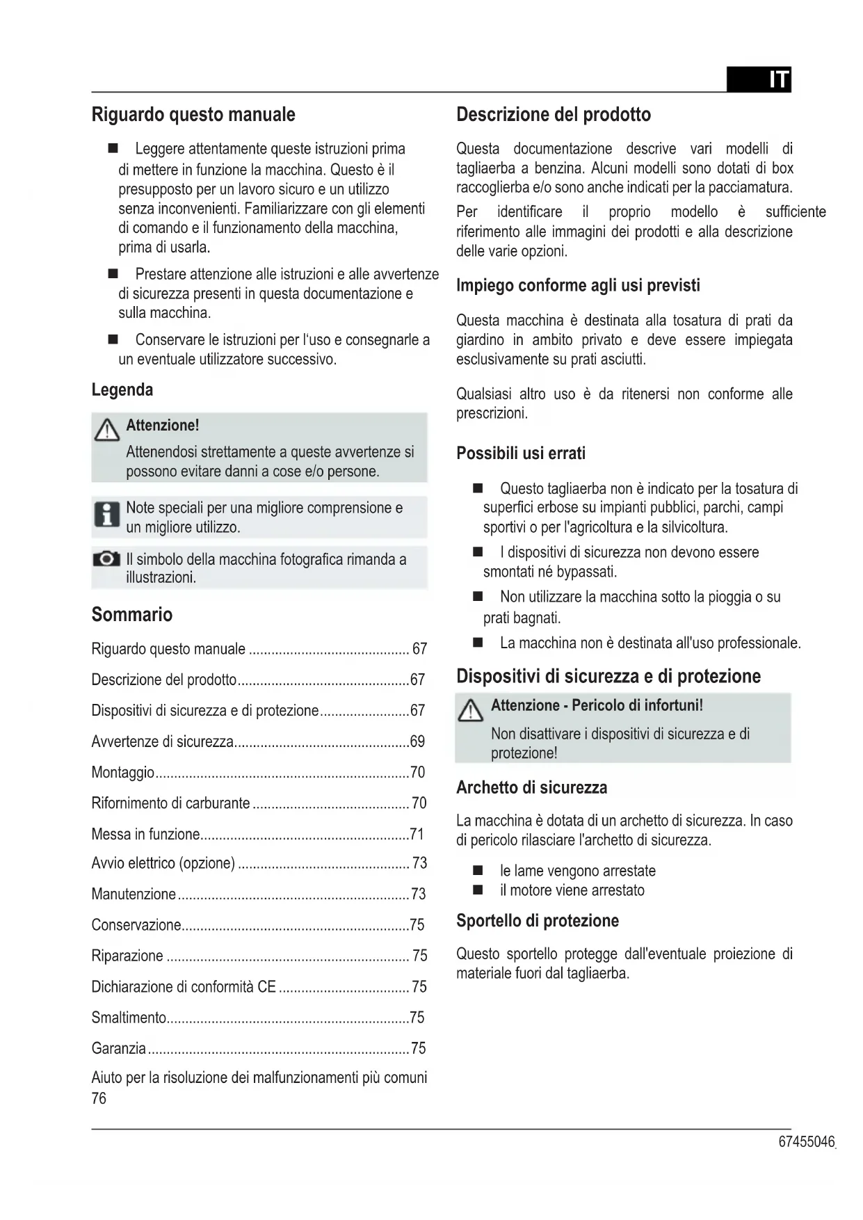 Riguardo questo manuale Leggere attentamente queste istruzioni prima di mettere in funzione la macchina. Questo è il presupposto per un lavoro sicuro e un utilizzo senza inconvenienti. Familiarizzare con gli elementi di comando e il funzionamento della macchina, prima di usarla. Prestare attenzione alle istruzioni e alle avvertenze di sicurezza presenti in questa documentazione e sulla macchina. Conservare le istruzioni per l‘uso e consegnarle a un eventuale utilizzatore successivo. Legenda Attenzione! Attenendosi strettamente a queste avvertenze si possono evitare danni a cose e/o persone. Note speciali per una migliore comprensione e un migliore utilizzo. Ilsimbolodellamacchinafotogracarimandaa illustrazioni. Descrizione del prodotto Questa documentazione descrive vari modelli di tagliaerba a benzina. Alcuni modelli sono dotati di box raccoglierba e/o sono anche indicati per la pacciamatura. Per identicare il proprio modello è sufciente fare riferimento alle immagini dei prodotti e alla descrizione delle varie opzioni. Impiego conforme agli usi previsti Questa macchina è destinata alla tosatura di prati da giardino in ambito privato e deve essere impiegata esclusivamente su prati asciutti. Qualsiasi altro uso è da ritenersi non conforme alle prescrizioni. Possibili usi errati Questo tagliaerba non è indicato per la tosatura di supercierbosesuimpiantipubblici,parchi,campi sportivi o per l'agricoltura e la silvicoltura. I dispositivi di sicurezza non devono essere smontati né bypassati. Non utilizzare la macchina sotto la pioggia o su prati bagnati. La macchina non è destinata all'uso professionale. Dispositivi di sicurezza e di protezione Attenzione - Pericolo di infortuni! Non disattivare i dispositivi di sicurezza e di protezione! Archetto di sicurezza La macchina è dotata di un archetto di sicurezza. In caso di pericolo rilasciare l'archetto di sicurezza. le lame vengono arrestate il motore viene arrestato Sportello di protezione Questo sportello protegge dall'eventuale proiezione di materiale fuori dal tagliaerba.IT Traduzione delle istruzioni per l‘uso originali