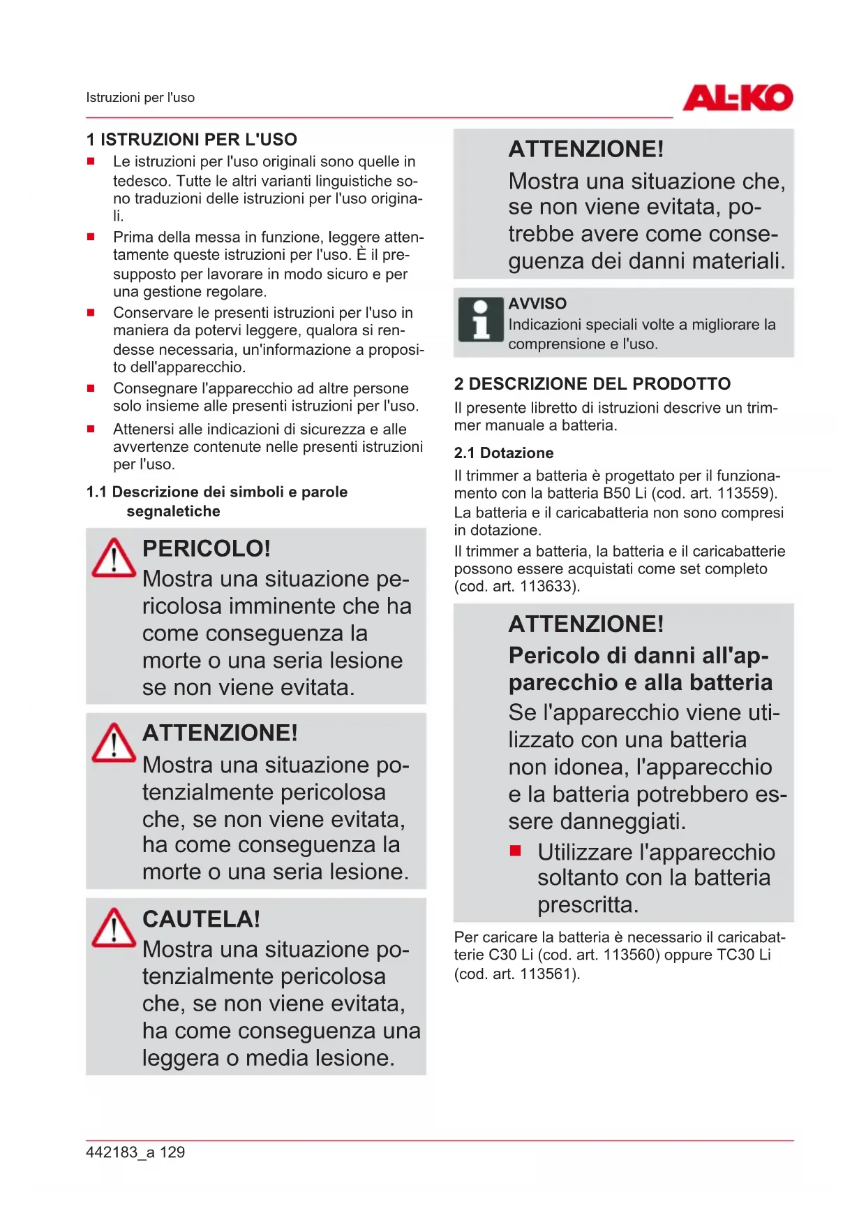 Il trimmer a batteria è progettato per il funziona- mento con la batteria B50 Li (cod. art. 113559). La batteria e il caricabatteria non sono compresi in dotazione. Il trimmer a batteria, la batteria e il caricabatterie possono essere acquistati come set completo (cod. art. 113633). ATTENZIONE! Pericolo di danni all'ap- parecchio e alla batteria Se l'apparecchio viene uti- lizzato con una batteria non idonea, l'apparecchio e la batteria potrebbero es- sere danneggiati.